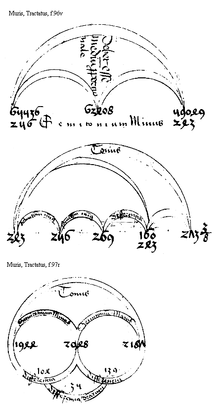 A diatesseron demptis duobus tonis quod remanet semitonium appellatur per septimam Sed quod illud sit minor pars toni probacio vt visum fuit in alia primi numeri inter quos appareat semitonium in diatesseron sunt 243. 256 quorum differencia est 13 Si igitur 13 faciens faciens semitonium sit duplicatus et tonum perfectum non attingat notum erit ipsum esse minorem vera parte media toni Sed sic est quam si dupletur medium scilicet 13 erit 26 qui additus super 243 reddit 269 qui ad 243 comparatus tonum non implet quod patet addita octaua parte 243 exit numerus 273 et 3/8 qui maior primo facies plene tonum quare ex hijs minor pars semitonij reperta est Amplius et per sextam visum est quod vera medietas toni est inter 16 et 17 Sed 13 comparatus ad 243 minor pars eius quam 16 et quam 17 Quoniam 13 ductus in se sexties decies aut septies decies non faciunt 243 ymo minus Eciam si ductus in se octies decies minus est 243 Racio quicquic minus est minore numerus et maiore Cum igitur 13 ad 243 sit minor pars eius quam 17 et 17 non facit toni medium sed multo minus Igitur multo forcius 13 ad 243 comparatus facit minus medietate toni quare minus semitonium inuentum est Aliter hoc idem probatur per medium proporcionale Nam natura numerorum talis est quod si duo numeri aliqua proporcione sint procreari ex eisdem in eadem proprocione manebunt [f.96v] vt 2 et 3 in sesqualtera proporcione se habent Ex hijs autem procreati sunt 469 inter quos eciam eadem proporcio Inuenitur Ducatur enim et tercia velut radices infra in se quam in alterum supradicto numeros generabunt Ex hoc sit numerum 243 et 256 Inter quos est proporcio semitonialis Ducantur ut radices tam in se quam vnus in alteram et producentur hij numeri 59049. 62408. 65536. Inter quos similiter proporcio semitonialis inuenitur Si igitur inter radices sint vere semitonii proporcio cum illa sit in numeris propositus duplicata sequetur quod inter extrema toni sit proporcio quod est falsum Nam si super primum sui octaua pars addatur tercia superabit Igitur inter primum et secundum non fuit vere semitonium Nec inter secundum et tercium Igitur primum et tercium tonum complere nequierunt Igitur similiter inter 2 radices que sunt 243 et 256 non fuit vera toni medietas ymo minus quod est propositum declaratum sicut presentes figure subscripte describunt