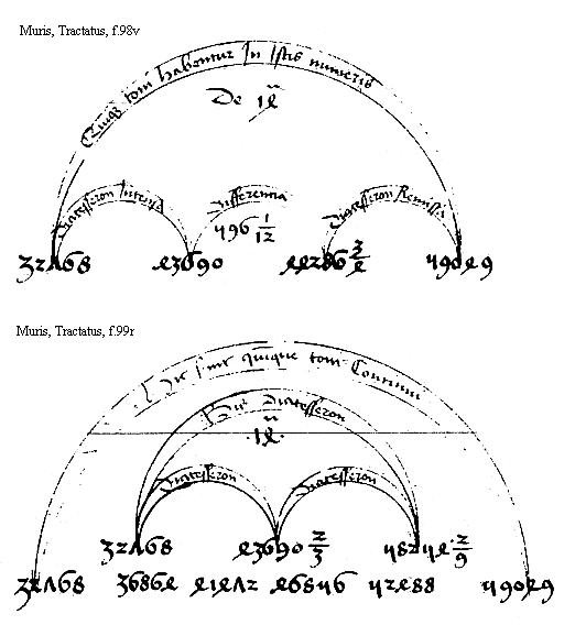 Per aliam probatum est quod diatesseron Includat duos tonos cum semitonio quod autem illud sit minus semitonium ostensum est et sic non reddet tonum si dupletur quod erat propositum sic ostendendo Diapason ex quarta continet in se diapenthe et diatesseron Sed diapenthe non continet aliud semitonium quam diatesseron quoniam non differt ab ea nisi tono per naturam Modo diapason amplectitur quinque tonos et duo semitonia per nonam que sunt minora quoniam diapason non continet sex tonos per immediatam Igitur illa duo semitonia que sunt in diatesseron et diapenthe sunt minora et illud quod est in diapenthe est illud quod est in diatesseron vt dictum In quinta ergo illud semitonium quod est in diatesseron minus semitonium id est pars minor toni [tono ante corr.] merito nuncupatur Sed nulla minor pars toni tonum reddet Integrum [f.98v] duplicata Quare semitonium quod est in diatesseron duplicatum aut bis sumptum nullum integre reddet tonum Sed aliter non potest poni bis diatesseron quinos habere tonos Igitur non habet quinque tonos sed quatuor cum duobus semitonijs minoribus et hoc est quod volebam Amplius hoc idem potest iterum declarari tendendo diatesseron et remittendo Sumptis ergo quinque tonis continuis sed supra primum numerum Iungatur sui tercia pars diatesseron est intensa et si ab vltimo numerorum quintum tonum complens sui quarta pars rescindatur diatesseron exibit remissa Tunc si igitur diatesseron duplex sit equalis 5 tonis ex hijs 5 tonis diatesseron Intensa et remissa concurrunt In eodem numero Et equali nulla differencia mediante Sed non erit ita ymo manifesta fiet differencia ut In hac potes videre figura quare diatesseron bis sumpta non equaliter diuiditur quinque tonis