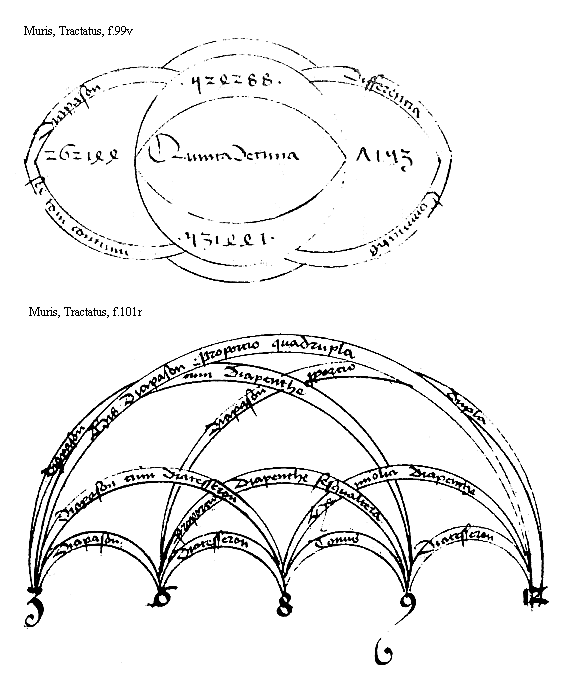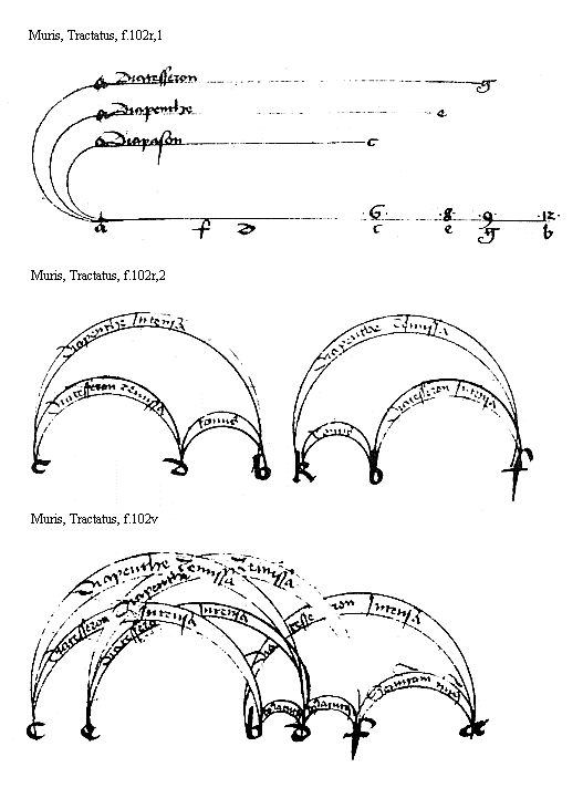 [Muris, Tractatus, f.102r,1; text: diatesseron, diapenthe, diapason, 6, 8, 9, 12, a, b, c, d, e, f, g] [MURMSPEC 08GF]