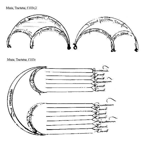 [Muris, Tractatus, f.102r,2; text: diapenthe intensa, diapenthe remissa, diatesseron remissa, tonus, diatesseron intensa, b, c, d, f, k] [MURMSPEC 08GF]