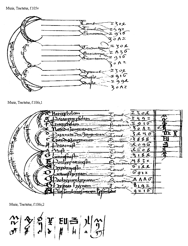 [Muris, Tractatus, f.106r,1; text: Tonus, semitonium, Bis diapason quadrupla proporcio, diapason, diatesseron, A, Proslambanomenos vel prosmelodos, 9216, B, Hypate hypaton, 8192, C, Parhypatehypaton, 7776, D, Licanoshypaton, 6912, E, Hypatemeson, 6144, F, Parhypatemeson, 5832, G, Licanosmeson, 5184, a, Mese, 4608, [sqb], Paramese, 4096, c, Tritediezeugmenon, 3888, d, Paranete diezeugmenon, 3456, e, Nete diezeugmenon, 3072, f, Triteyperboleon, 2916, g Paraneteyperboleon, 2592, aa, Neteyperboleon, 2304, [Mu], [Lambda], [Upsilon], [Epsilon], [Phi], [Zeta]] [MURMSPEC 11GF]