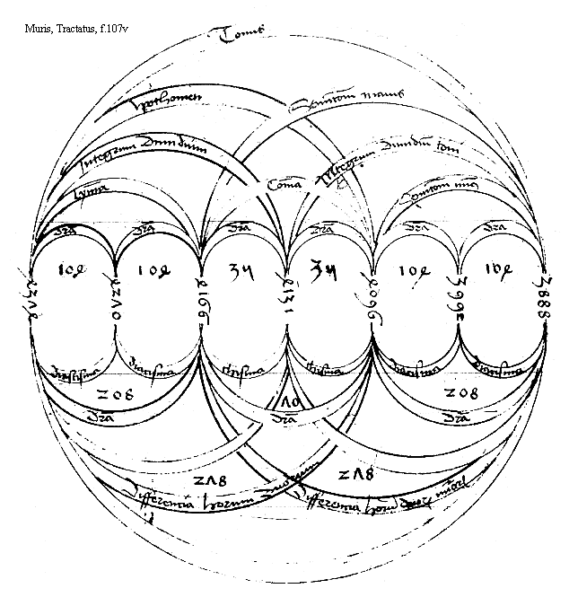 Per numeros qui neminem fallunt hoc idem aliter declaratur Sunt quinque toni continui Sicut dicitur in precedente tunc si super primum numerum qui est fundamentum relacionis sui tercia pars addatur exibit semel diatesseron per figuram circulorum super quam iterum producta sui tercia pars adiungatur ad eum similiter alia diatesseron producetur quare de primo ad ultimum erit bis diatesseron Igitur comparetur iste vltimus [f.99r] numerus faciens ad primum bis diatesseron ad vltimum numerum facientem quintum tonum et erit minor numerus qui bis diatesseron complet quam numerus faciens quintum tonum Ergo bis diatesseron non continet quinque tonos propter hoc hanc inspice figuram