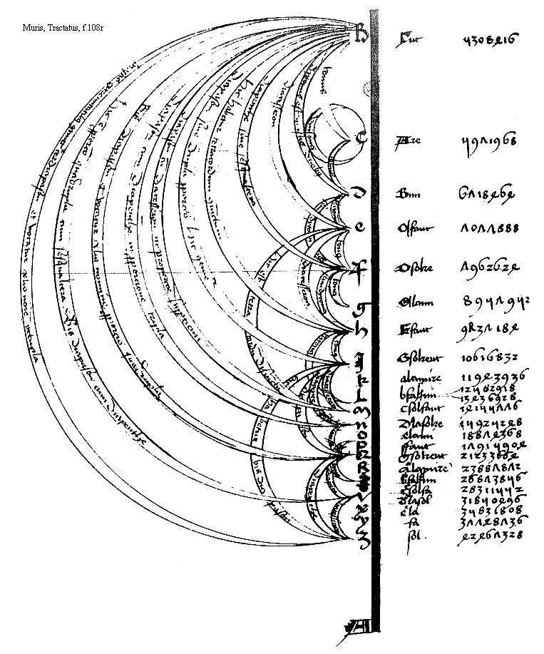 [f.108r] [Muris, Tractatus, f.108r; text: A, B, [Gamma]ut, 5308416, C, Are, 5971968, d, Bmi, 6718464, e, Cfaut, 7077888, f, Dsolre, 7962624, g, Elami, 8957952, h, Ffau,t 9437184, I, Gsolreut, 10616832, k, alamire, 11943936, L, bfa[sqb]mi, 12582918, 13436928, m, csolfaut, 14155776, n, dlasolre, 15925248, o, elami, 18874368, p, ffaut, 17915904, Q, gsolreut, 21233664, R, aa lamire, 23887872, S, bb fa[sqb]mi, 26873856, T, cc solfa, 28311552, V, dd lasol, 31850496, X, ee la, 34831808, Y, fa, 37748736, Z, sol, 42467328, vnisonus, tonus, semitonium, semidytonus, dytonus est in istis duobus, diatesseron, tritonus, diapenthe, diapente sesqualtera, diapenthe siue sesqualtera, hic est tetracordum disiunctum, hic habetur bis diapason, hic habetur tetracordum coniunctum, diapason siue dupla proporcio hic continetur, diapason cum diatesseron in proporcione superparcienti, diapason cum diapenthe in proporcione tripla, Bis diapason et vocatur alio nomine proporcio quadrupla, Hic est proporcio quadrupla cum sesqualtera. id est Bis diapason cum diapenthe, In istis extremitatibus continet ter diapason et vocatur alio nomine octupla] [MURMSPEC 13GF]