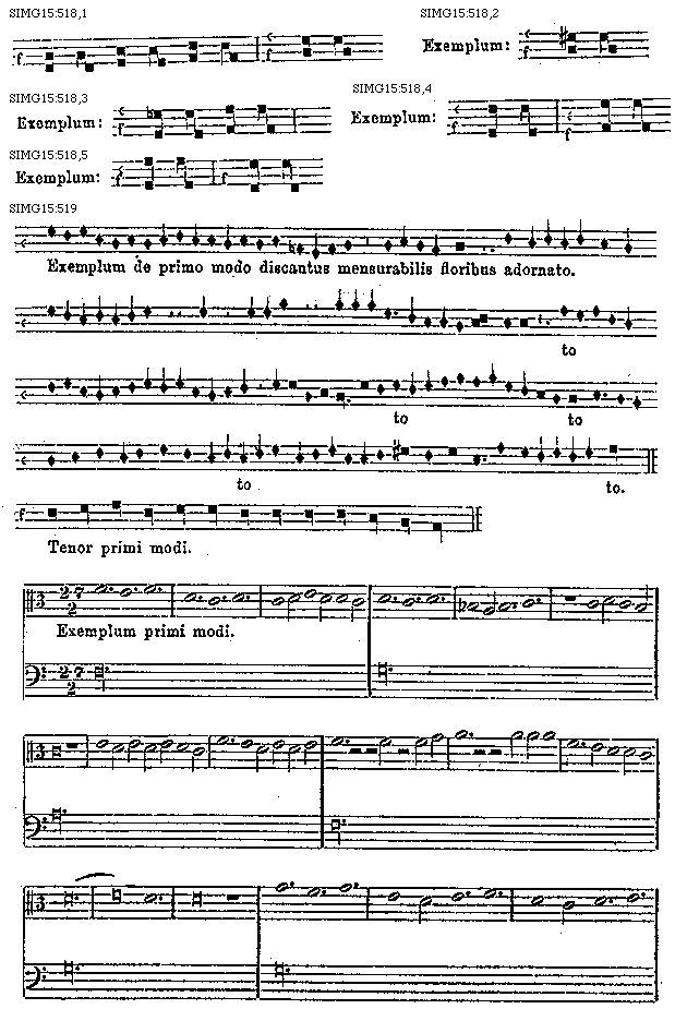 [SIMG15:519; text: Exemplum de primo modo discantus mensurabilis floribus adornato. Tenor primi modi. Exemplum primi modi.] [PETCOM 05GF]