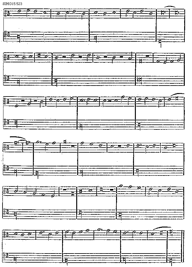 Et similiter falsa musica potest communiter accipi in d-lasolre dicendo ut ibidem pro voce ascendente [quod] per voces usque b fa [sqb] mi acuto, descendendo per voces usque in d-lasolre mutando nihilominus per falsam musicam, quando necesse fuerit et hoc propter diapente sive tonum cum diapente supra b fa [sqb] mi grave discantando supra tenorem in f-faut et g-solreut acutum tam in elevatione quam in depressione quandoque similiter exeuntes, ut hic patet in exemplo: