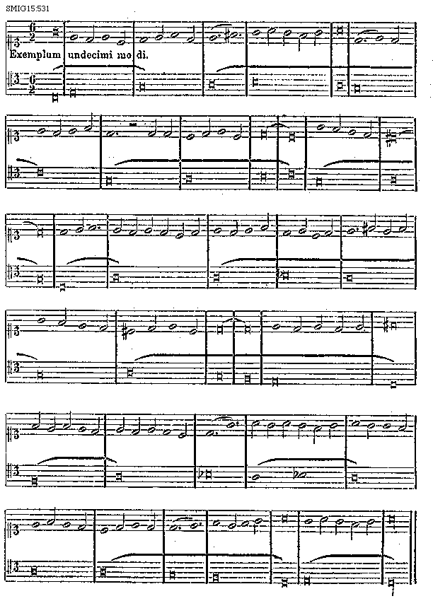 Duodecimus modus, qui est sextus de tempore imperfecto, constat ex una brevi imperfecta de minori prolatione. Potest enim ista brevis imperfici secundum quosdam a sola minima a parte praecedente vel subsequente. [532] Dicunt autem alii, quod in ista prolatione minori imperfecta prima notula debet figurari per semibrevem perfectam, cui semibrevi debet attribui punctus perfectionis et subsequi minima. Et utraque regula est bona. Et potest dividi et diminui in semibreves et minimas suae prolationis vel in valorem earundem usque ad quatuor minimas, ut patet hic: