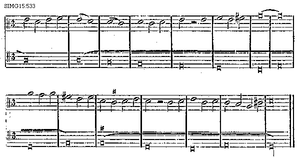 [511] Vel discantus pro prima voce sit in diapente supra tenorem et pro secunda voce ascendat unum tonum et erit in tono cum diapente et iterum descendat a dicto tono cum diapente per unum tonum et habemus diapente, tenore tamen non mutato, ut hic: