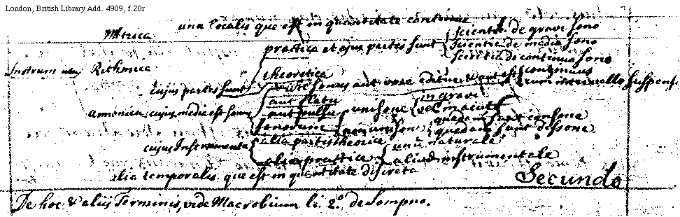 [London, British Library, Add. 4909, f.20r; text: Instrumentum, Metrica, Rithmica, Armonica, una localis que est in quantitate continue, alia temporalis que est in quantitate discreta, cujus partes sunt, practica et ejus partes sunt, scientia de gravi sono, scientia de medio sono, scientia de continuo sono, theorica, cujus media est sonus, sive sonus aut voce editur et aut est continuus cum intervallo suspensa aut flatu aut pulsu sonorum unisone in gravi vel in acutu non unisone quedam sunt consone quedam sunt dissone cujus Instrumenta alia partis theorice alia practice unum naturale aliud instrumentale De hoc et aliis Terminis, vide Macrobium li. 2o. de Sompno.] [QUAPRIA 01GF]