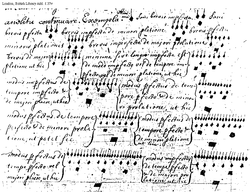 [London, British Library, Add. f.37v; text: Minima, Semibrevis imperfecta. Semibrevis perfecta, brevis imperfecta de minori prolatione, brevis perfecta minoris prolationis, brevis imperfecta de majori prolatione, brevis de majori prolatione ut hic, minima sive longae imperfecta est de modo imperfecto vel de tempore imperfecto vel de minori prolatione, ut hic, modus imperfectus de tempore imperfecto et de majori prolatione, ut hic modus perfectus de tempore perfecto et de minori prolatione, ut hic, ut patet sic, modus perfectus de tempore perfecto et de minori prolatione ut hic, modus perfectus de tempore perfecto vel majori prolatione, ut hic, modus imperfectus de tempore perfecto et de majori prolatione, ut hic] [QUAPRIA4 01GF]