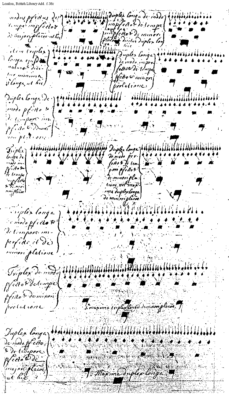 [f.38r] [London, British Library, Add. f.38r; text: modus perfectus de tempore imperfecto et de majori prolatione ut hic, duplex longa de modo imperfecto et de tempore imperfecto et de minori prolatione dicitur duplex longa, ut hic, item triplex longa ejusdem naturae et dicitur minima et longa, ut hic, duplex longa de modo imperfecto et de tempore perfecto et minori prolatione, duplex longa de modo perfecto et de tempore imperfecto et de minor prolationi, Triplex longa de modo imperfecto et de tempore imperfecto et de minori prolatione, Duplex longa de modo perfecto et de tempore perfecto et de minori prolatione vel maxima duplex longa de minori prolatione, Triplex longa de modo perfecto et de tempore imperfecto et de minori prolatione, Triplex de modo perfecto et de tempore perfecto et de minori prolatione, prima maxima triplex longa de minori prolatione. Duplex longa de modo perfecto et de tempore perfecto et de majori prolatione, ut hic, Maxima duplex longa.] [QUAPRIA4 02GF]