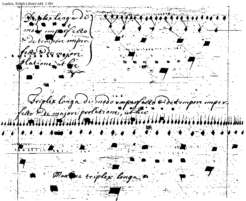 [f.38v] [London, British Library, Add. f.38v; text: Duplex longa de modo imperfecto et de tempore inperfecto et de majori prolatione, ut hic, Triplex longa de modo inperfecto et de tempore inperfecto et de majori prolatione, ut hic, Maxima triplex longa] [QUAPRIA4 03GF]