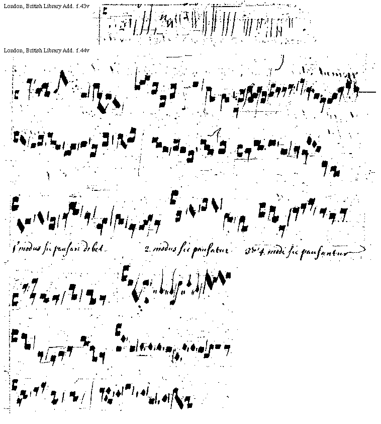 [f.44v] [London, British Library, Add. f.44v; text: Primus modus sic pausari debet, Secundus modus sic pausatur, Tertii et Quarti modi sic pausantur] [QUAPRIA4 04GF]