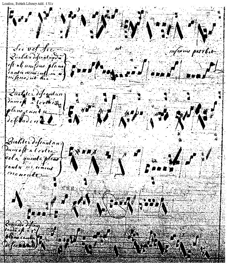 [f.51v] [London, British Library, Add. f.51v; text: Quomodo discantandum est a sexta plano cantu in eodem manente, ut hic, Qualiter discantandum est ab octavo voce plano cantu descendente sive in eodem manente, Quomodo discantandum est a decima nota plano cantu in eodem manente sive descendente. Et notandum quod decima nota et tertia sunt ejusdem natura tam in ascendente quam in descendente, ut patet in tertio principali. Quomodo discantandum est duodecima nota plano cantu descendente sive in eodem manente, ut hic, Qualiter discantandum est a tertiadecima sive quintadecima nota plano cantu in eodem manente sive descendente] [QUAPRIA4 06GF]