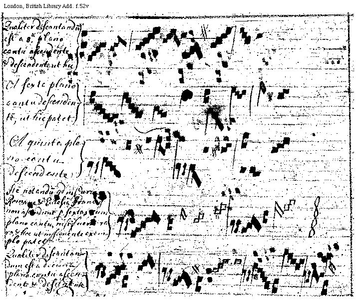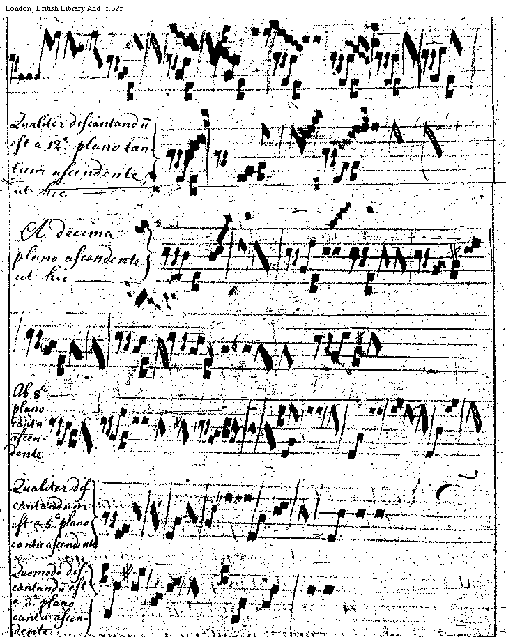 [f.52v] [London, British Library, Add. f.52v; text: Qualiter discantandum est a tertia plano cantu ascendente et descendente, ut hic, A sexta plano cantu descendente, ut hic patet, A quinta plano cantu descendente, Item notandum quod in Curia Romana et Ecclesia Francigena non ascendunt per sextas cum plano cantu, nisi fuerit raro et hoc ut in sequente exemplo patet, Qualiter discantandum est a decima plano cantu ascendente et descendente] [QUAPRIA4 08GF]
