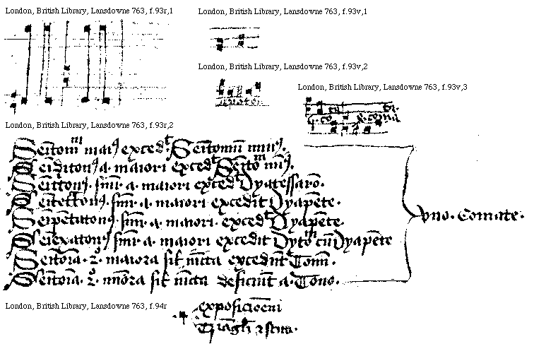 [London, British Library, Lansdowne 763, f.93r,2; text: Semitonium maius excedit Semitonium minus. Semiditonus a. maiori excedit Semitonium minus. Semitritonus. semper a. maiori excedit Dyatessaron. Semitetratonus. semper a. maiori excedit Dyapente. Semipentatonus semper a. maiori. excedit Dyapente. Semiexatonus semper a. maiori excedit Dytonum cum Dyapente Semitonia duo maiora simul iuncta excedunt Tonum. Semitonia duo minora simul iuncta deficiunt a. Tono. vno.Comate.] [TORKDEC 05GF]