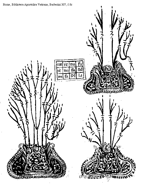 [f.9r] [Rome, Biblioteca Apostolica Vaticana, Barberini 307, f.9r; text: 2, 3, 4, 6, ut, re, me, fa] [VERDMPV 03GF]