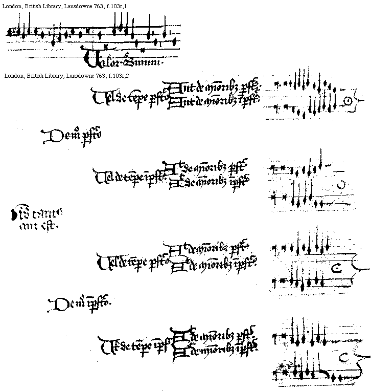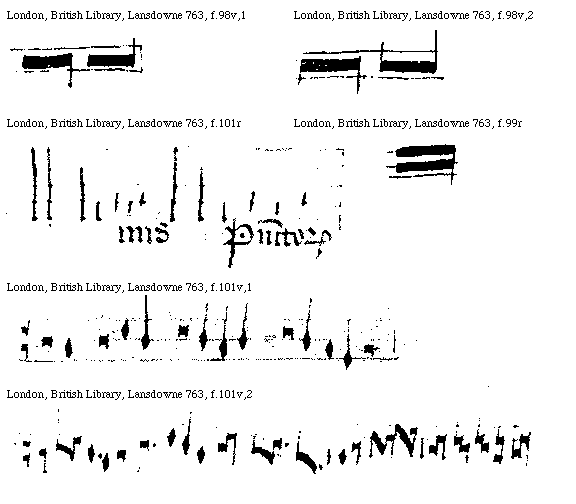 Perfecta longissima. continet nouem longas perfectas .27. breues perfectas .81. semibreues perfectas et .243. minimas [signum] Inperficiens longissima. continet sex longas perfectas [f.[[99]]100r] duodeuiginti breues perfectas quinque minores perfectas et 162 minimas [signum] Inperficiens longior et vocatur Inperficiens quia inperficit longissimam. et potest dici perfecta longior eo quod est in se perfecta. quam aliqui vocant largam perfectam continet tres longas perfectas nouem breues perfectas .27. minores perfectas .81. minimas [signum] Inperfecta longior siue semilongior quam aliqui vocant largam inperfectam siue semilargam. continet duas longas perfectas. sex breues duodeuiginti minores perfectas 54 minimas. [signum] Inperficiens longa. et vocatur Inperficiens quia inperficit longiorem siue largam. et dicitur longa perfecta continet tres breues perfectas nouem minores perfectas .27. minimas. [L,L,L] Inperfecta longa siue semilonga. et dicitur semilonga .a. semis quod est inperfecta. et longa quasi. inperfecta longa continet duas breues. perfectas sex minores perfectas duodeuiginti minimas. [L,L,L] Inperficiens Breuis. et dicitur Inperficiens quia inperficit longam. et dicitur breuis perfecta. continet tres minores perfectas nouem minimas. [B,B] Inperfecta Breuis siue Semibreuis et dicitur .a. semis quod est inperfecta et breuis. continet duas minores sex minimas. [B,B] Inperficiens Breuior siue perfecta breuior siue minor perfecta et dicitur Inperficiens eo quod inperficit breuem. continet tres [S,S,S] Inperfecta Breuior siue semibreuior siue minor inperfecta continet duas minimas. [S,S] Inperficiens breuissima siue minima presentans vnitatem. et est indiuisibilis. et dicitur Inperficiens eo quod inperficit minorem. que dicitur Minor perfecta [M,M,M]. Set nunc addita est vlterius id est vltra minimam. scilicet non per artem set per placitum que dicitur Crocheta vt hic. [SM,SM,SM,SM]