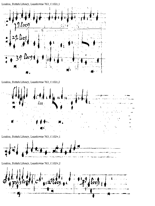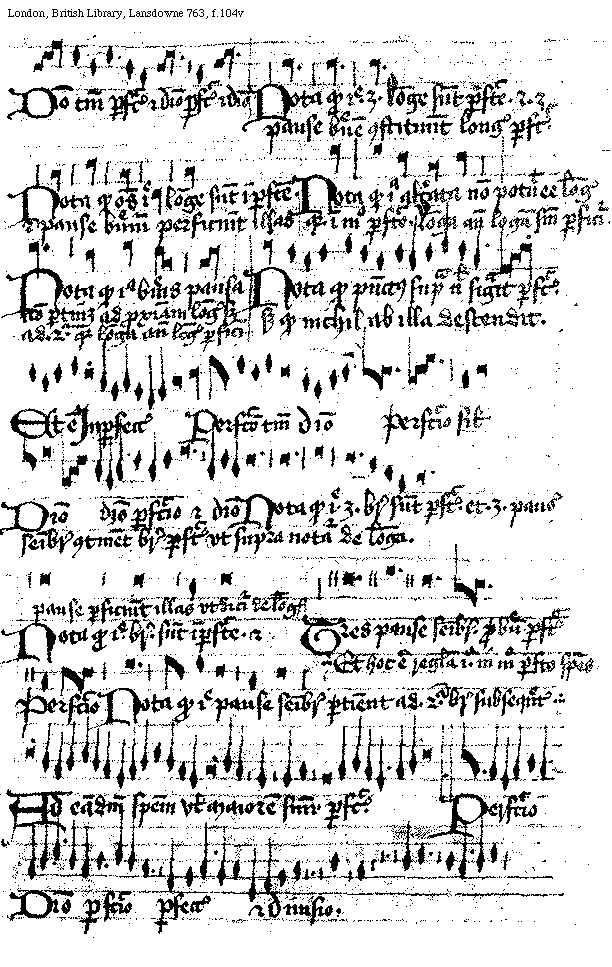 [f.[[103]]104v] [London, British Library, Lansdowne 763, f.104v; text: Diuisio tantum perfeccio et diuisio perfeccio et diuisio, Nota quod ille tres longe sunt perfecte et tres pause breuem constituunt longam perfectam. Nota quod omnes ille longe sunt inperfecte. et pause breuium perficiunt illas, Nota quod illa alterata non potuit esse longa quia in modo perfecto. Longa ante longam semper perficitur. Nota quod illa breuis pausa non pertinet ad proximam longam set ad secundam quia longa ante longam perficitur, Nota quod punctus supra nichil significat perfeccio. set quod nichil ab illa descendit. Et est Inperfectus, Perfeccio tantum diuisio, Perfeccio similiter, Diuisio, diuisio perfeccio, et diuisio, Nota quod ille tres breues sunt perfecte. et tres pause semibreui continent breuem perfectam vt supra notatur de longa. Nota quod ille breues sunt inperfecte. et pause perficiunt illas vt dicitur de longis, Tres pause semibreuis. pro breue perfecta, Perfeccio. Nota quod ille pause semibreuis pertinent ad secundam breuem subsequentem. Et hoc est regula prima in modo perfecto species. Ad eandem speciem vel maiorem semper perfectam. Perfeccio Diuisio perfeccio, perfeccio et diuisio.] [WALREGU 06GF]