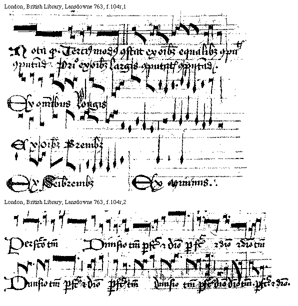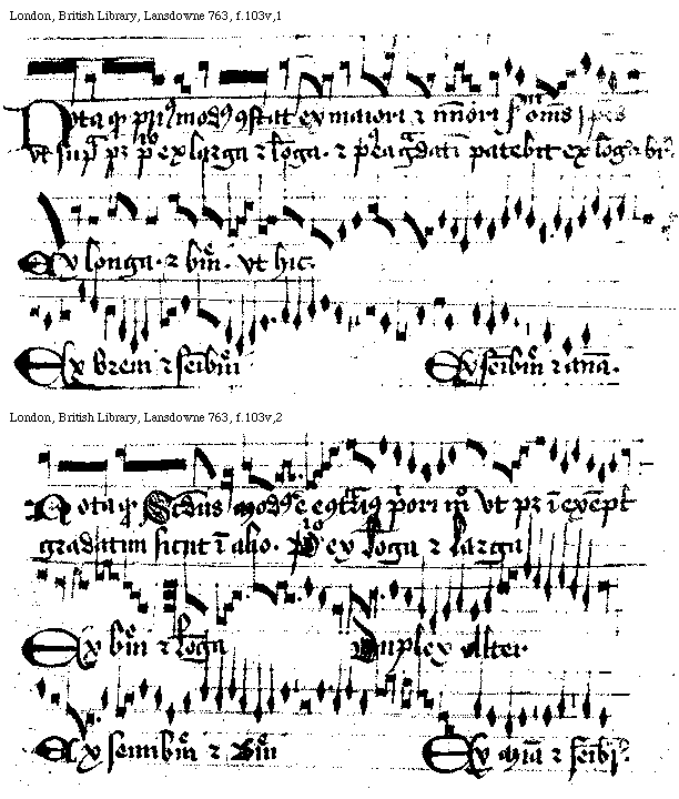 [London, British Library, Lansdowne 763, f.103v,1; text: Nota quod primus modus constat ex maiori et minori secundum omnes species vt supra patet primo ex larga et longa. et postea gradatim patebit ex longa et breui. Ex longa. et breui. vt hic. Ex breui et semibreui, Ex semibreui et minima.] [WALREGU 04GF]