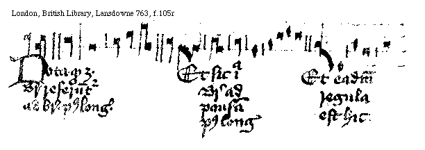 [London, British Library, Lansdowne 763, f.105r; text: Nota quod tres Breues referuntur ad breuem post longam. Et sic illa Breuis ad pausam post longam. Et eadem regula est hic.] [WALREGU 07GF]