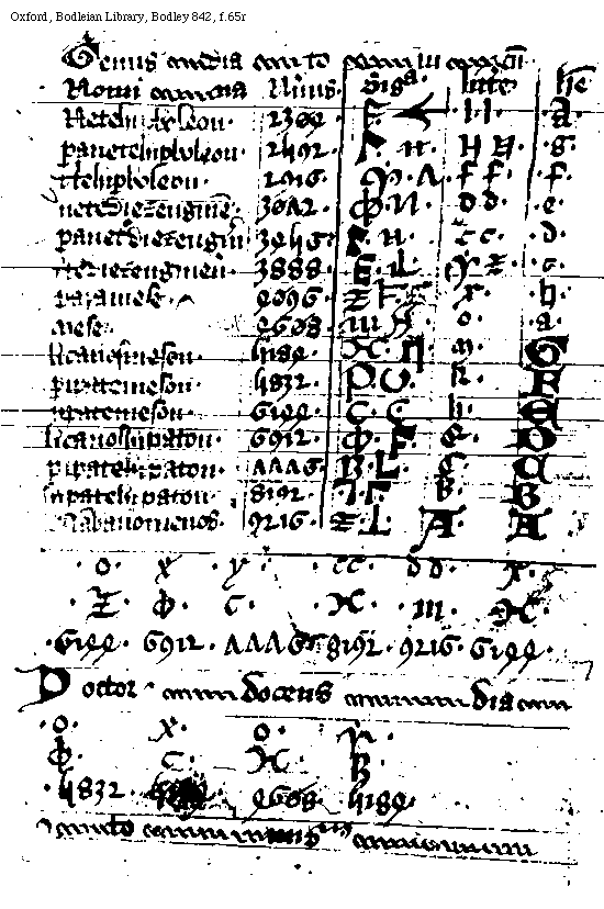 [Oxford, Bodleian Library, Bodley 842, f.65r; text: Genus diatonicum. Nomina, Numerus, Signa, littere, Nete hiperboleon, 2304, .ll. .aa. paranete hiperboleon, 2592, .g. trite hiperboleon, 2916, [Upsilon].[Lambda], .ff. .f. nete diezeugmenon, 3072,. [Phi], .dd. .e. paranete diezeugmenon, 3456, [Gamma].[Eta]. .cc. .d. trite diezeugmenon, 3888. [Epsilon].[Upsilon]. .c. paramese, 4096. [Zeta]. .x. .[sqb]. mese, 4608. .o. .a. licanos meson. 5184. m. G, paripate meson. 5832. [Rho]. k. F, upate meson. 6144. h. E, licanos hipaton. 6912. [Phi]. F. E. D, paripate hipaton. 7776. [Beta]. C. C, hipate hipaton. 8192. [Gamma]. B. B, proslambanomenos. 9216. A. A, Doctor docens diatonus .o. .[Zeta]. .6144. x [Phi] 6192. .y C. 7776. .cc. [Eta] 8192. .dd. .iii. 9216. x. [Eta]. 6144. .o. [Phi]. .5832. x. C. 5184. o. [Eta]. 4608. [Upsilon]. [Beta]. 5184.] [WILBREV 01GF]