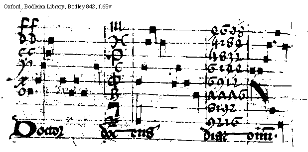 [f.65v] [Oxford, Bodleian Library, Bodley 842, f.65v; text: ff iii 4608 dd [Eta] 5184 cc [Rho] 5832 y C 6144 x [Phi] 6912 o [Beta] 7776 [signum] 8192 [Zeta] 9216 Doctor docens diatonum.] [WILBREV 02GF]