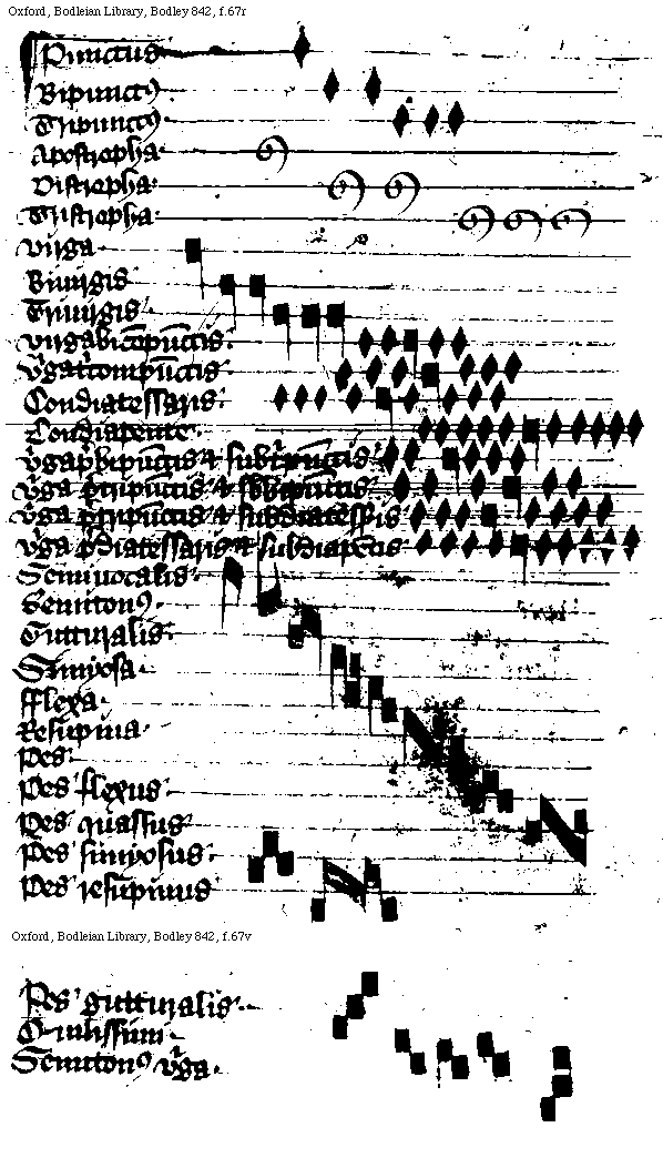 [Oxford, Bodleian Library, Bodley 842, f.67r; text: Punctus, Bipunctus, Tripunctus, apostropha, Distropha, Tristropha, Uirga, Biuirgis, Triuirgis, Uirga bicompunctis, Uirga tricompunctis, Condiatessaris, Condiapente, Uirga prebipunctis et subtripunctis, Uirga pretripunctis et subbipunctis, Uirga pretripunctis et subdiatessaris, Uirga prediatessaris et subdiapentis, Semiuocalis, Semitonus, Gutturalis, Simyosa, Flexa, Resupina, Pes, Pes flexus, Pes quassus, Pes simyosus, Pes resupinus] [WILBREV 04GF]