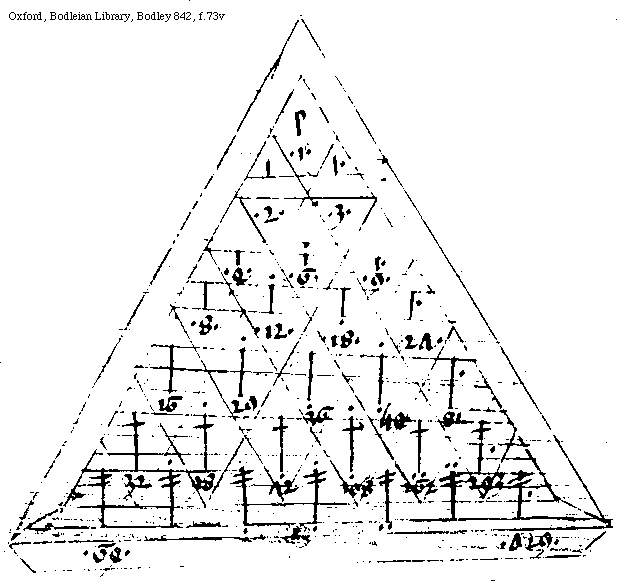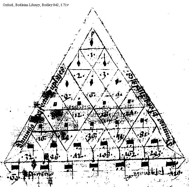 Tercio sequitur regule pro intellectu superioris [Omnino inperfecta, semel perfecta, bis perfecta, ter perfecta, quater perfecta, quinquies perfecta, Omnino perfecta m. alt. in marg.] [f.72r] trianguli. Prima regula. Omnis nota preter simplam carens puncto omnino imperfecta est. Secunda regula. Omnis nota que supra se punctum habet; semel perfecta est. quia ipsa perfecta est ex proxima nota oblique ascendente id est tres tales ualet. et tamen eius illa pars non est perfecta, aut quia minima perfecta que prima species perfecta cadit in composicionem eius. Tercia regula. Omnis nota que sub se punctum habet; bis perfecta dicitur quia et ipse et proxima oblique ascendens perfecte sunt sicud prius aut quia tam semibreuis quam minima perfecte cadunt in composicionem eius. Quarta regula. Omnis nota que supra se punctum habet; et sub se similiter. ter perfecta dicitur. quia et ipsa cum duabus speciebus ex quibus ipsa componitur. perfecte sunt. aut quia tam breuis. semibreuis. et minuta. perfecte omnino cadunt in composicionem eius. Quinta regula. Omnis nota que sub se simul duo puncta habet. quater perfecta dicitur. quia et ipsa perfecta est et tres proxime species oblique ascendentes ex quibus ipsa componitur. aut eciam quia longa. breuis. semibreuis. et minuta. omnino perfecte cadent in composicionem eius. Sexta regula. Omnis nota que supra se simul duo puncta habet; quinquies perfecta dicitur. quia et ipsa perfecta est et quatuor proxime species oblique ascendentes. ex quibus ipsa componitur. aut quia larga. longa. breuis. semibreuis. et minuta. omnes perfecte cadunt in eius composicionem. Septima regula. Omnis nota que post se punctum habet. omnino perfecta dicitur. quia et ipsa perfecta est et omnes partes ipsam oblique componentes omnino perfecte sunt. excepta sola simpla [f.72v] que est inpartibilis. Octaua regula. A qualibet. nota ad proximam superiorem recte ascendendo duplares. ad sinistram uero oblique; triplares facimus notas. Nona regula. Ab aliqua nota a dextris directe progrediendo; sexquialteras. Oblique uero ascendendo uersus dexteram; sexquitercias proporciones efficimus. Decima regula. Conuersim uero proporcionaliter. procedendo subduplares. subtriplares. subsesquialteras. proporciones efficimus. Corelarium. In latere dextro trianguli sunt .6. note omnino perfecte. In latere sinistro; omnino inperfecte totidem. Inter duo uero latera et in basi .15. que respectu diuersarum notarum quandoque perfecte quandoque inperfecte. dinoscuntur.