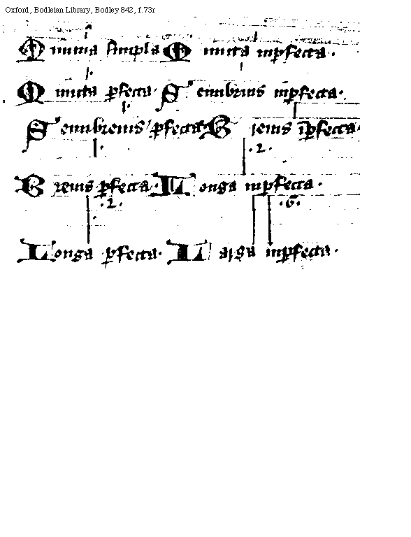 [Oxford, Bodleian, Bodley 842, f.73r; text: Minima simpla, Minuta inperfecta, Minuta perfecta, Semibreuis inperfecta, Semibreuis perfecta, Breuis inperfecta, Breuis perfecta, Longa inperfecta, Longa perfecta, Larga inperfecta, .2. .6.] [WILBREV 06GF]