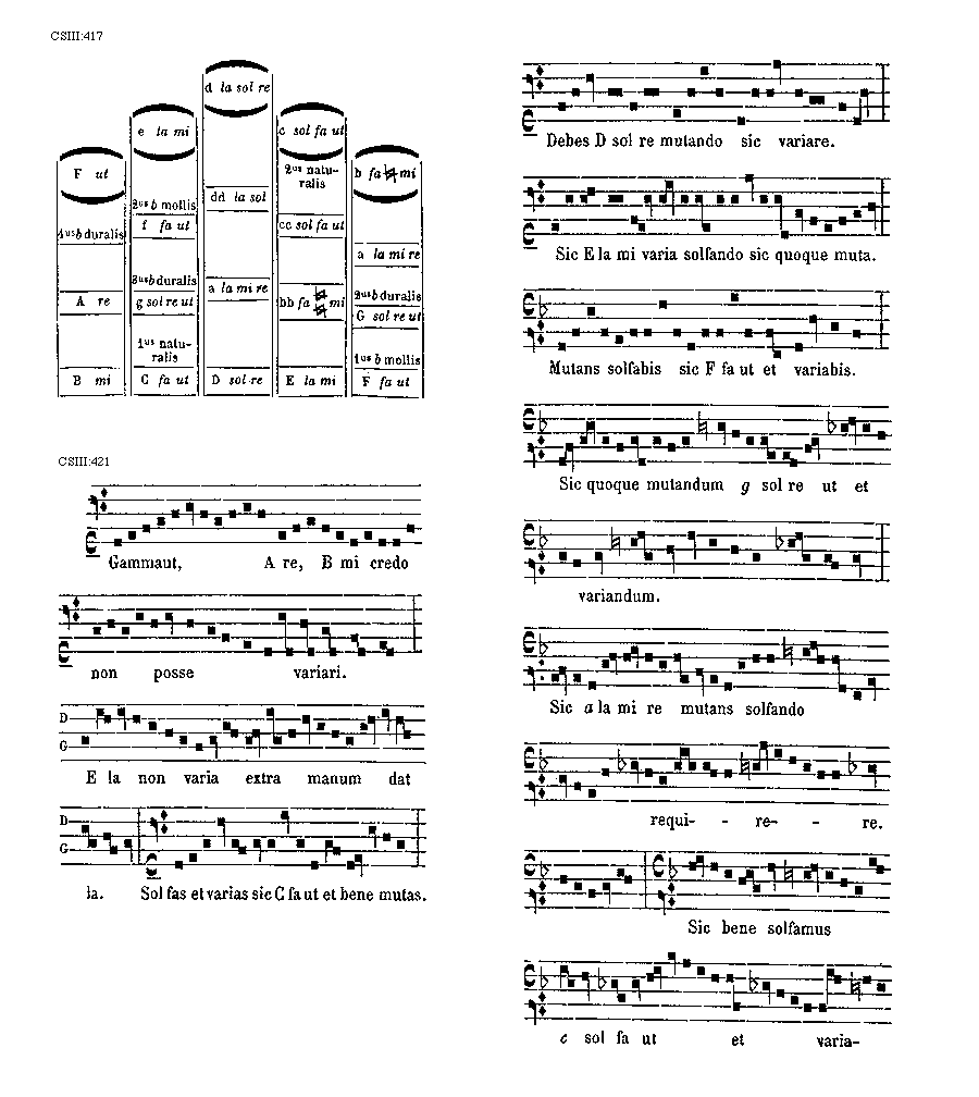 [CSIII:417; text: F ut, e la mi, d la sol re, c sol fa ut, b fa [sqb] mi, primus b duralis, secundus b mollis, secundus naturalis, f fa ut, dd la sol, cc sol fa ut, a la mi re, tertius b duralis, A re, g sol re ut, a la mi re, bb fa [sqb] [sqb] mi, secundus b duralis, G sol re ut, primus naturalis, B mi, C fa ut, D sol re, E la mi, primus b mollis, F fa ut] [ANO11TRA 01GF]