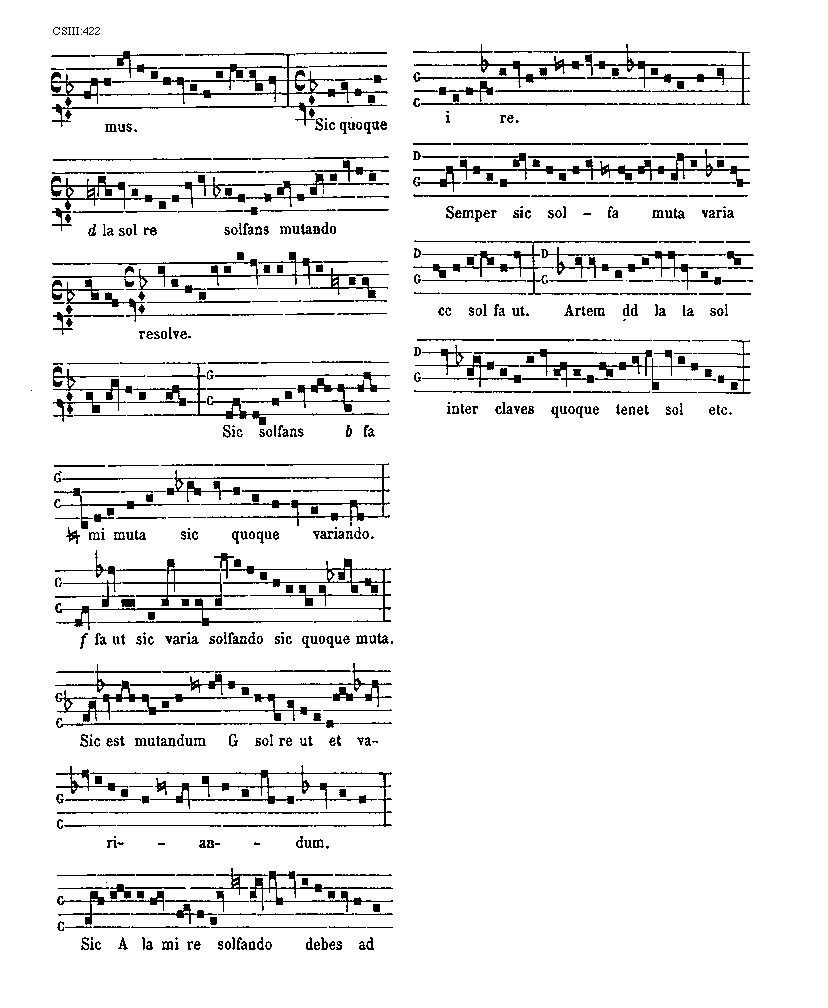 [422] [CSIII:422; text: Sic quoque d la sol re solfans mutando resolve. Sic solfans b fa [sqb] mi muta sic quoque variando. f fa ut sic varia solfando sic quoque muta. Sic est mutandum G sol re ut et variandum. Sic A la mi re solfando debes ad i re. Semper sic solfa muta varia cc sol fa ut. Artem dd la la sol inter claves quoque tenet sol etc.] [ANO11TRA 02GF]