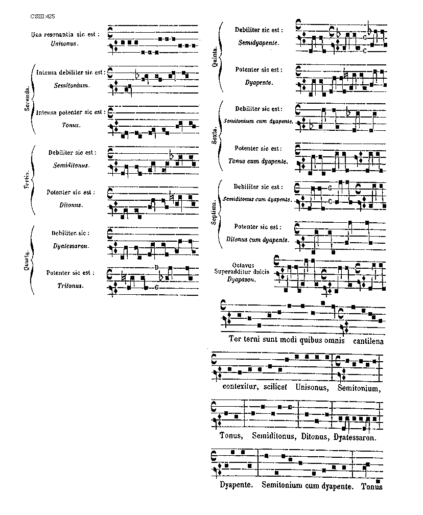 Sed modi principales sunt duplices, simplices scilicet et compositi. Simplices sunt tredecim, scilicet: unisonus, semitonium, tonus, semiditonus, ditonus, tritonus, dyatessaron, dyapente, semitonium cum dyapente, exacordum, semitonium cum exacordo, eptacordum et dyapason.