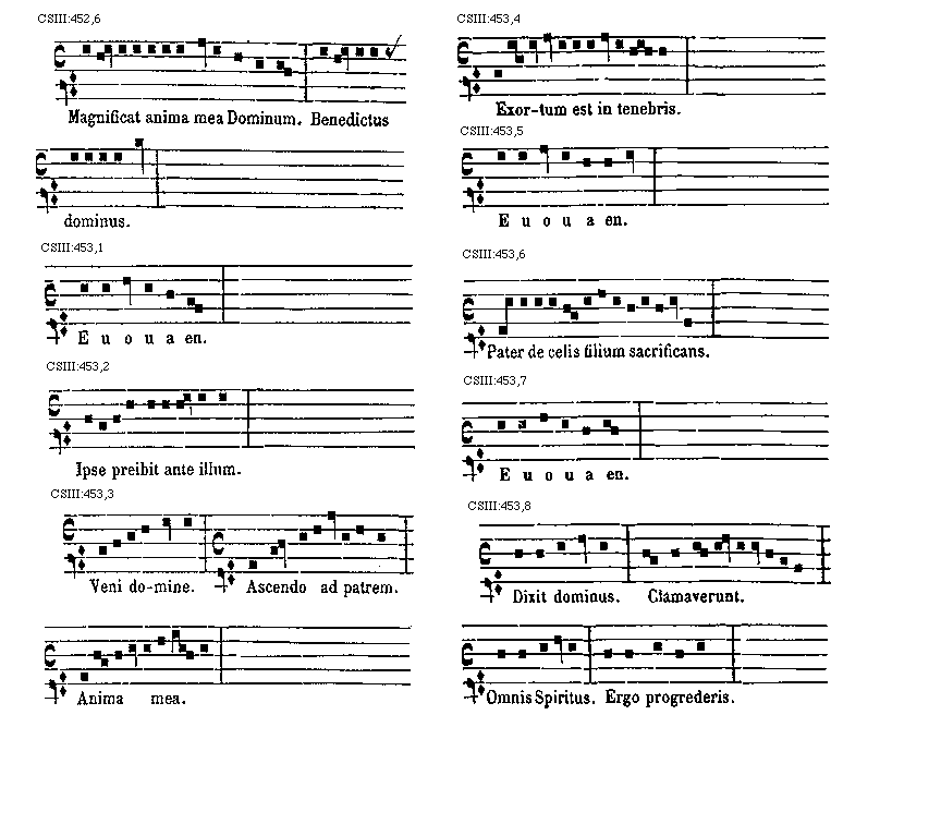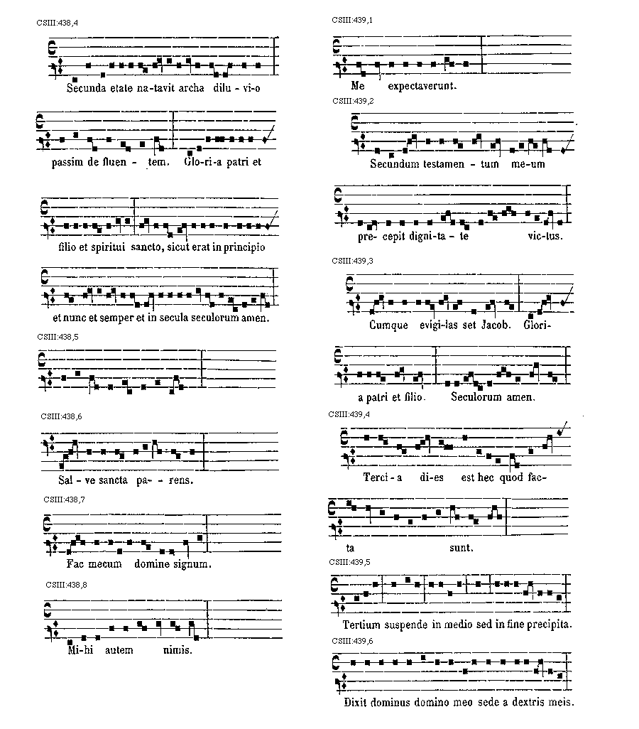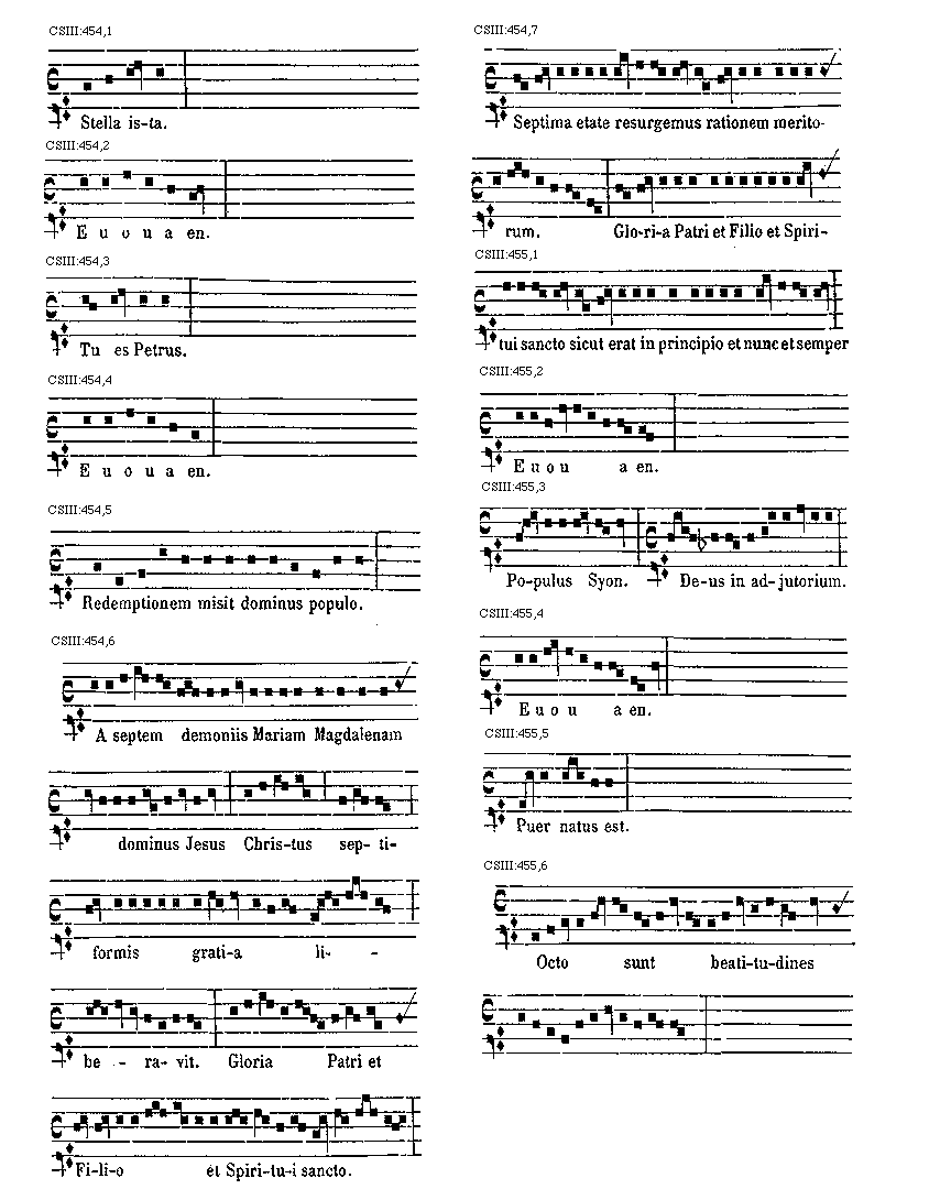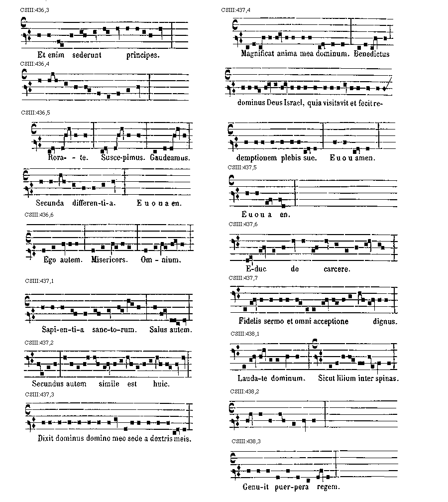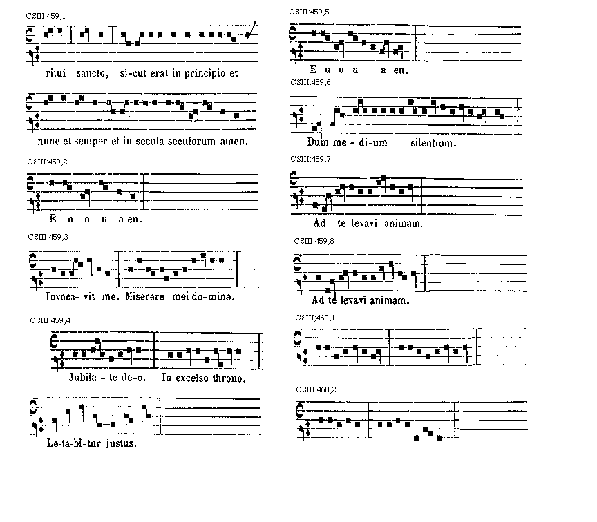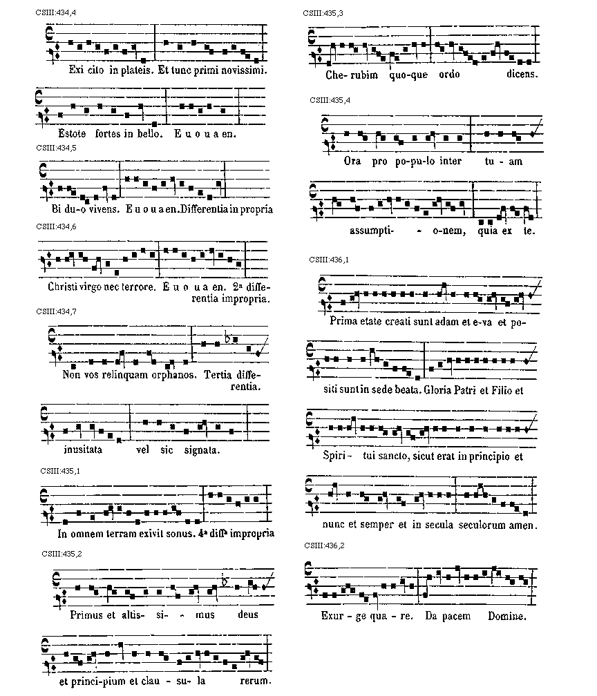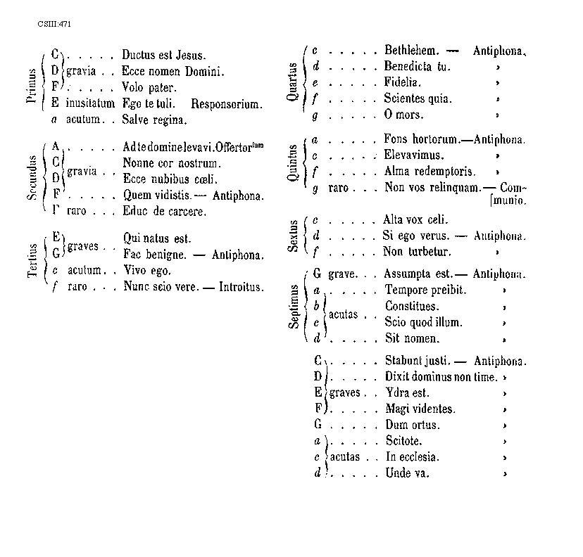 [CSIII:471; text: Primus, C, D, F, gravia, Ductus est Jesus. Ecce nomen Domini. Volo pater. E inusitatum, Ego te tuli. Responsorium. a acutum, Salve regina. Secundus, A, Ad te domine levavi. Offertorium, Nonne cor nostrum. Ecce nubibus coeli. Quem vidistis.--Antiphona. [Gamma] raro, Educ de carcere. Tertius, E, G, graves, Qui natus est. Fac benigne.--Antiphona. c acutum, Vivo ego. f raro, Nunc scio vere.--Introitus. Quartus, c, Bethlehem.--Antiphona. d Benedicta tu. e, Fidelia. f, Scientes quia. g, O mors. Quintus, a, Fons hortorum.--Antiphona. Elevavimus. Alma redemptoris. g raro, Non vos relinquam.--Communio. Sextus, Alta vox celi. d, Si ego verus.--Antiphona. Non turbetur. Septimus, G grave, Assumpta est.--Antiphona. b, acutas, Tempore preibit. Constitues. Scio quod illum. Sit nomen. Stabunt justi.--Antiphona. Dixit dominus non time. Ydra est. Magi videntes. Dum ortus. Scitote. In ecclesia. Unde va.] [ANO11TRA 29GF]