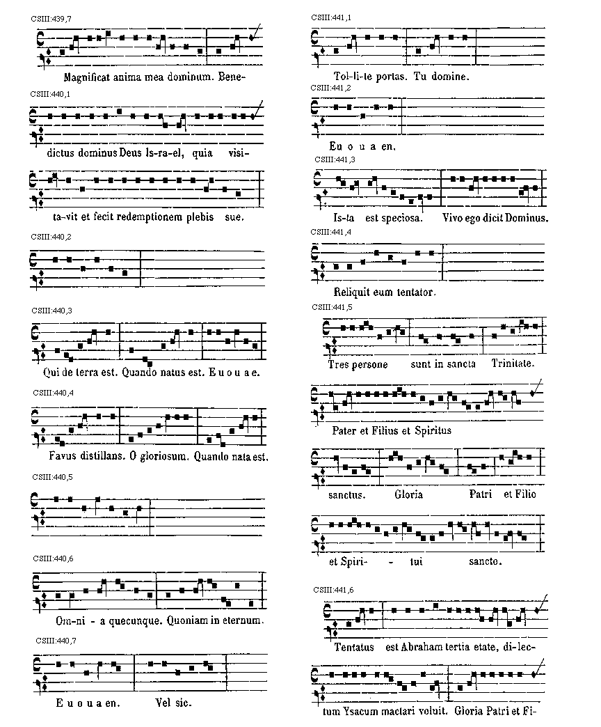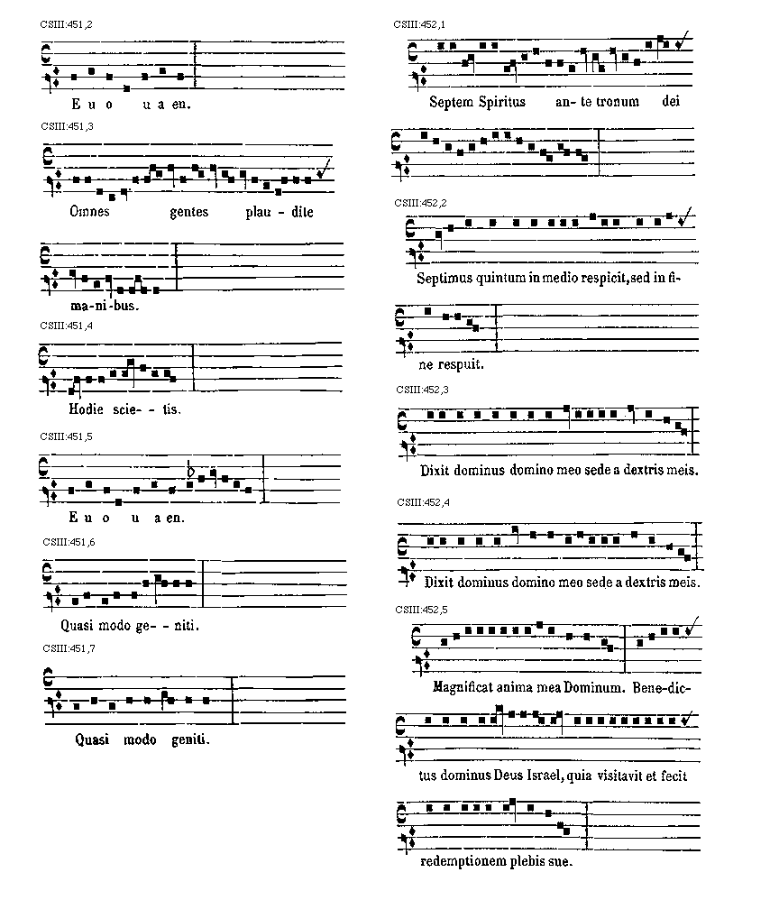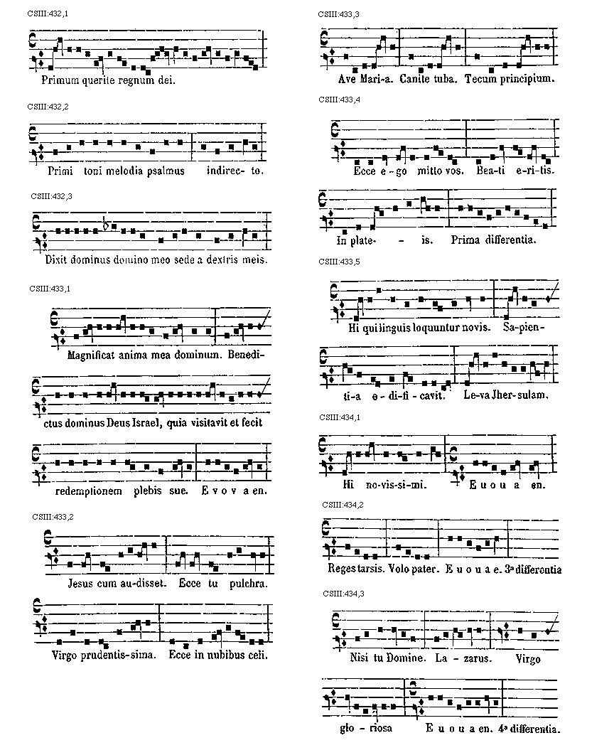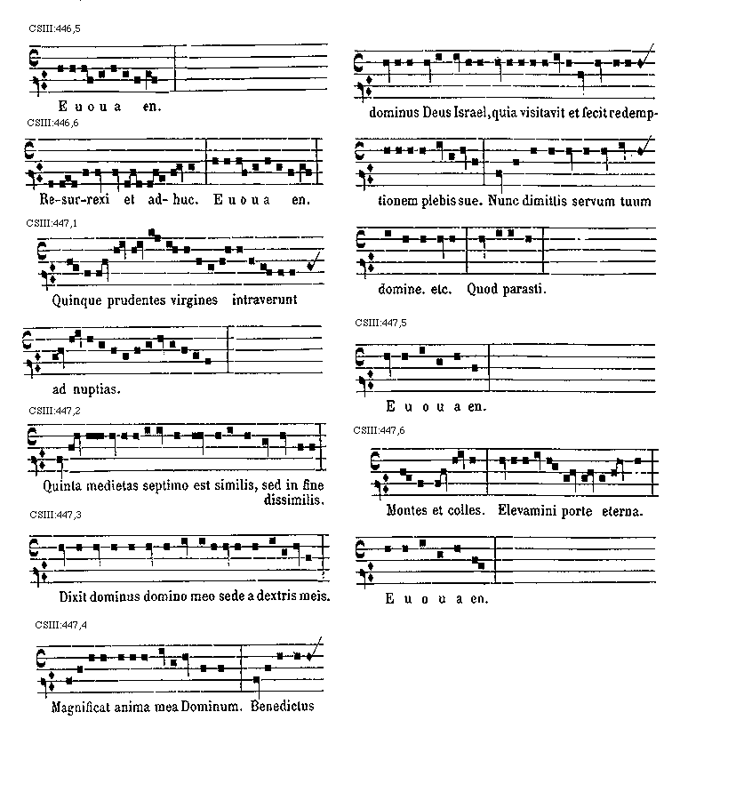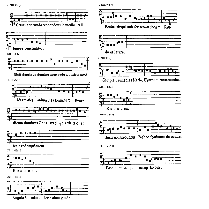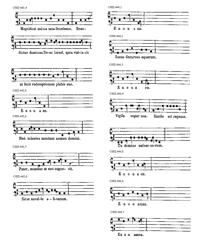 [CSIII:471; text: Primus, C, D, F, gravia, Ductus est Jesus. Ecce nomen Domini. Volo pater. E inusitatum, Ego te tuli. Responsorium. a acutum, Salve regina. Secundus, A, Ad te domine levavi. Offertorium, Nonne cor nostrum. Ecce nubibus coeli. Quem vidistis.--Antiphona. [Gamma] raro, Educ de carcere. Tertius, E, G, graves, Qui natus est. Fac benigne.--Antiphona. c acutum, Vivo ego. f raro, Nunc scio vere.--Introitus. Quartus, c, Bethlehem.--Antiphona. d Benedicta tu. e, Fidelia. f, Scientes quia. g, O mors. Quintus, a, Fons hortorum.--Antiphona. Elevavimus. Alma redemptoris. g raro, Non vos relinquam.--Communio. Sextus, Alta vox celi. d, Si ego verus.--Antiphona. Non turbetur. Septimus, G grave, Assumpta est.--Antiphona. b, acutas, Tempore preibit. Constitues. Scio quod illum. Sit nomen. Stabunt justi.--Antiphona. Dixit dominus non time. Ydra est. Magi videntes. Dum ortus. Scitote. In ecclesia. Unde va.] [ANO11TRA 29GF]