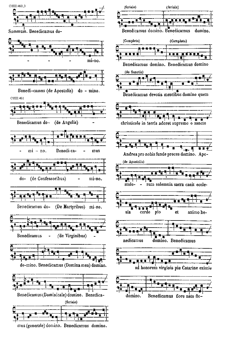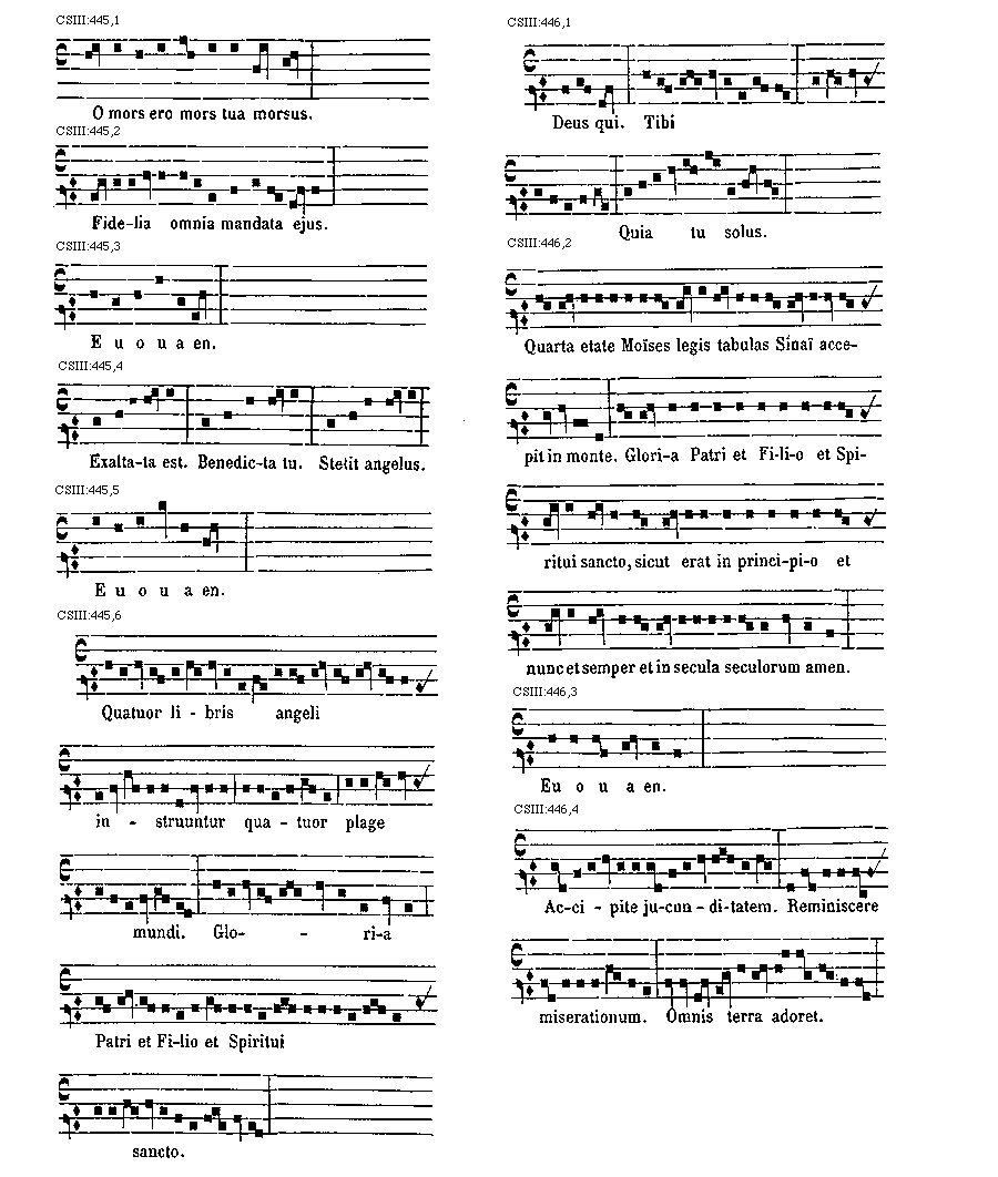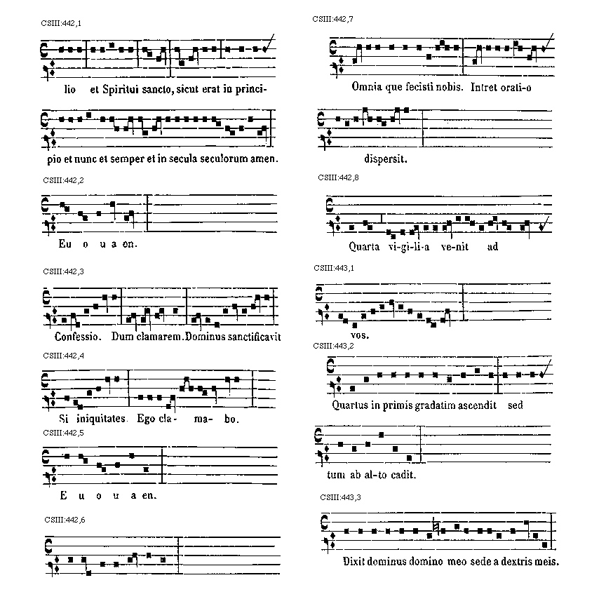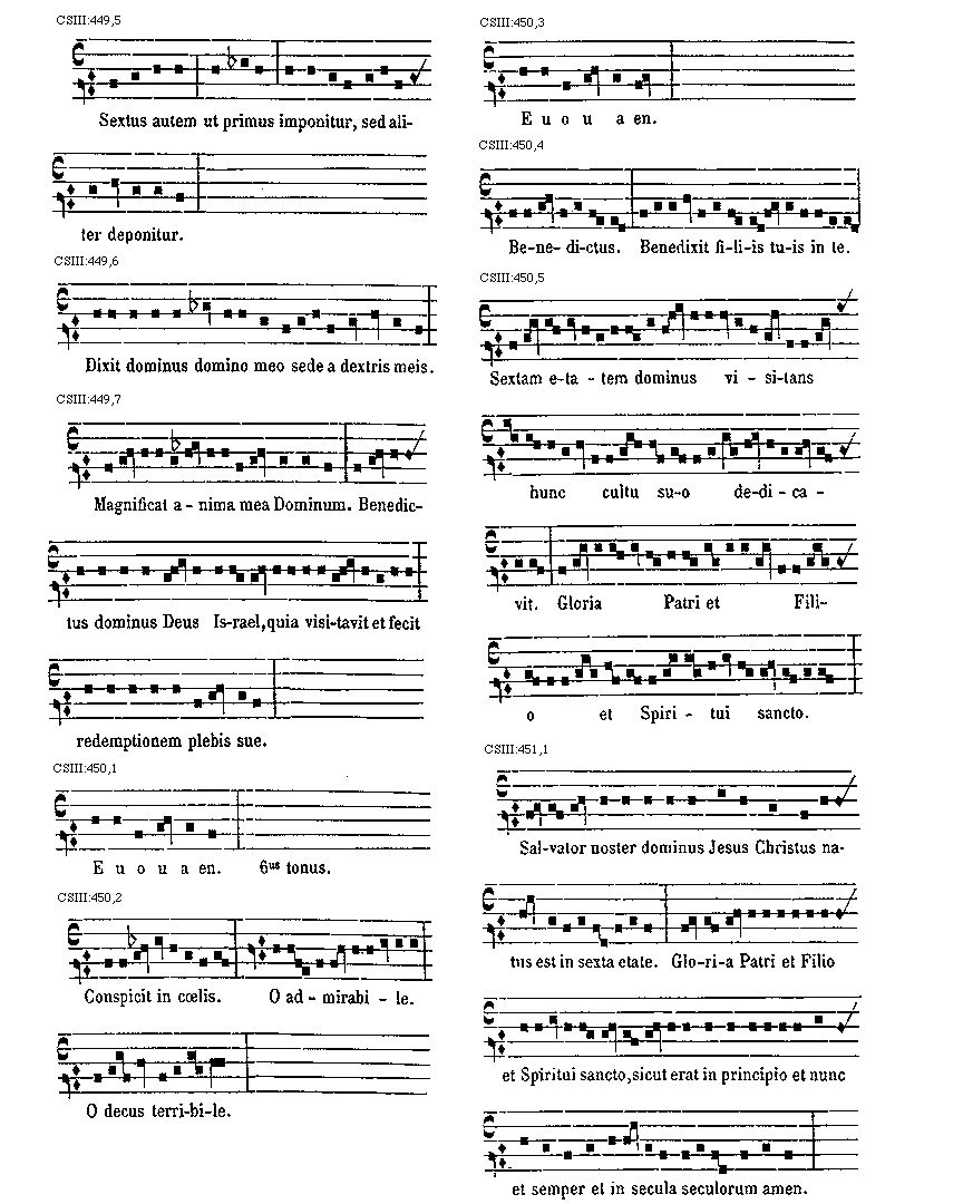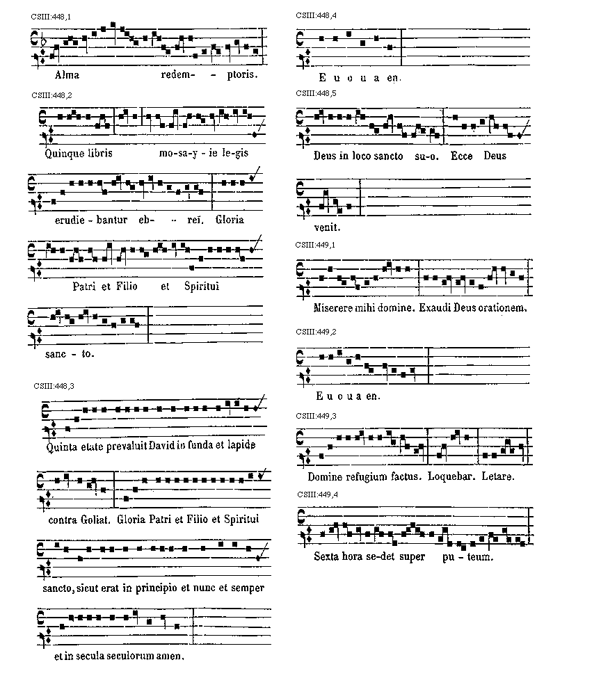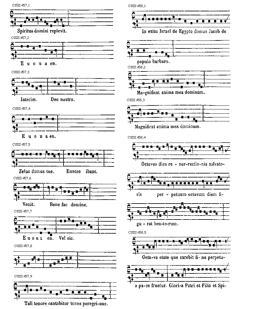 [CSIII:471; text: Primus, C, D, F, gravia, Ductus est Jesus. Ecce nomen Domini. Volo pater. E inusitatum, Ego te tuli. Responsorium. a acutum, Salve regina. Secundus, A, Ad te domine levavi. Offertorium, Nonne cor nostrum. Ecce nubibus coeli. Quem vidistis.--Antiphona. [Gamma] raro, Educ de carcere. Tertius, E, G, graves, Qui natus est. Fac benigne.--Antiphona. c acutum, Vivo ego. f raro, Nunc scio vere.--Introitus. Quartus, c, Bethlehem.--Antiphona. d Benedicta tu. e, Fidelia. f, Scientes quia. g, O mors. Quintus, a, Fons hortorum.--Antiphona. Elevavimus. Alma redemptoris. g raro, Non vos relinquam.--Communio. Sextus, Alta vox celi. d, Si ego verus.--Antiphona. Non turbetur. Septimus, G grave, Assumpta est.--Antiphona. b, acutas, Tempore preibit. Constitues. Scio quod illum. Sit nomen. Stabunt justi.--Antiphona. Dixit dominus non time. Ydra est. Magi videntes. Dum ortus. Scitote. In ecclesia. Unde va.] [ANO11TRA 29GF]