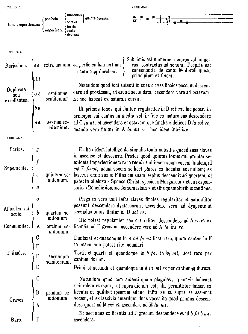 Item notandum predictarum clavium que dicuntur signate, que non signate. Signate dicuntur que in libris et in lineis signantur et sunt quinque: [Gamma] fundamentale F finale, c acutum et d excellens. Alie vero omnes preter istas dicuntur non signate quia non signantur. De numero autem signatarum que communiter signantur ut F finale et c acutum; [Gamma] vero grecum raro signatur; g acutum rarius; d excellens rarissime. Etiam signatur b fa, [sqb] mi per duplicem modum, scilicet: b fa, per b rotundum, et [sqb] mi, per h, et tunc canitur fa per b molle, et mi per [sqb] durum. Item sciendum quod cantus, quantum sufficit ad propositum, sic describitur: est neuma sive tropus debite principiatus, et bene terminatus secundum illarum exigentiam arsim et thesin non excedens. Item notandum cantus est triplex, scilicet: naturalis, [sqb] duralis, et b mollis; et triplex est modus cantandi in manu secundum omnem musicam seu cantum, scilicet durus qui fit cum audacia, mollis femineus qui fit cum timore, et naturalis id est mediocriter formatus. Versus: