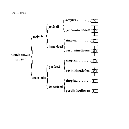 [CSIII:469,1; text: Omnis cantus aut est: majoris, perfecti, simplex, Od on staff2, per diminutionem. Oddim on staff4, imperfecti, simplex, C on staff2, per diminutionem. Odim on staff4, brevioris, perfecti, simplex, O on staff2, per diminutionem. Odim on staff4, imperfecti, simplex, C on staff2, per diminutionem. Cdim on staff4] [ANO11TRA 27GF]