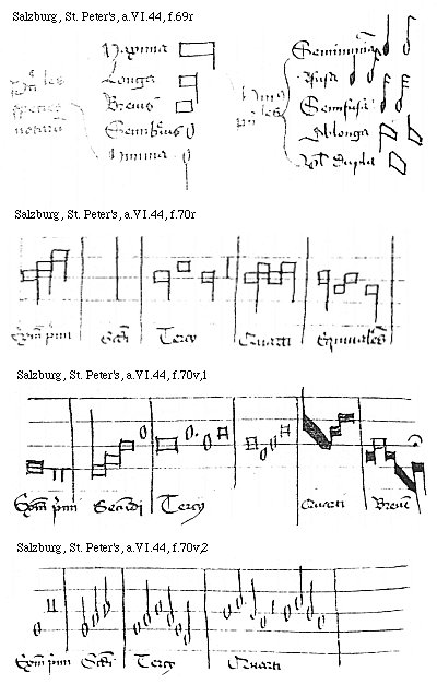 [Salzburg, St. Peter's, a.VI.44, f.71r; text: Modus est duplex, Perfectus, Imperfectus, Tempus est duplex, Perfectum, Imperfectum, Prolacio est duplex, Mayor, Minor.] [ANOFMUS 02GF]