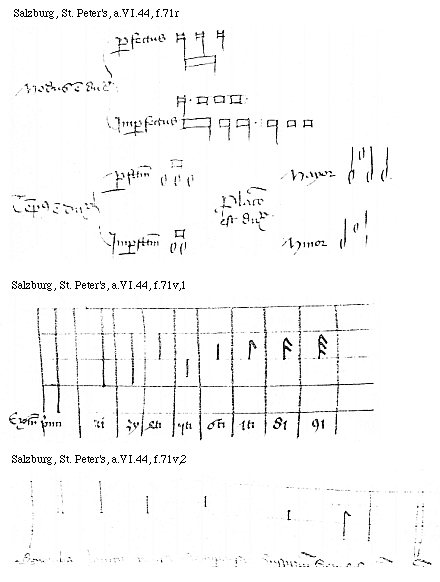[Salzburg, St. Peter's, a.VI.44, f.71v,1; text: Exemplum primi, secundi, tercy, quarti, quinti, sexti, septimi, octaui, noni.] [ANOFMUS 02GF]