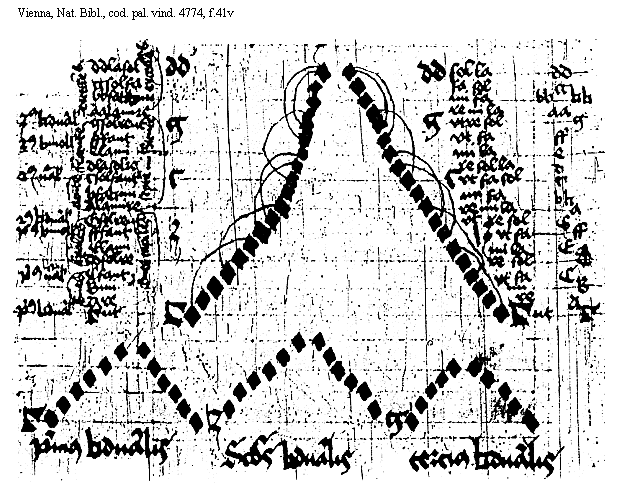 [Vienna, Nat. Bibl., cod. pal. vind. 4774, f.41v; text: primus [sqb]duralis, primus naturalis, primus bmollis, secundus [sqb]duralis, secundus naturalis, secundus bmollis, tercius [sqb]duralis, graues, finales, acutes, superacute, excellentes, [Gamma]ut, Are, Bmi, Cfaut, Dsolre, Elami, Ffaut, Gsolreut, alamire, bfa[sqb]mi, csolfaut, dlasolre, elami, ffaut, gsolreut, aalamire, bbfa[sqb][sqb]mi, ccsolfa, ddlasol, Graues capitales, septem minute acute, [signum], sol fa, fa sol, mi fa, re mi la, vt re sol, vt fa, mi la, re sol la, vt fa sol, re sol, mi, re, dd, cc, bb [sqb][sqb], aa, g, F, e, d, c, b [sqb], a, G, E, D, C, B, A, [Gamma]. Primus [sqb]duralis, Secundus [sqb]duralis] [ANOHOL3 01GF]