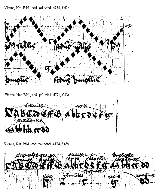 [Vienna, Nationalbibliothek, cod. pal. vind. 4774, f.43v; text: [Gamma], A, B, C, D, E, F, G, a, b[sqb], c, d, e, f, g, aa, cc, dd, graues, finales, acute, superacute, excellentes, Capitales graues, Minute, duplicate, Signate, raro, communiter, rarius, rarissime] [ANOHOL3 02GF]