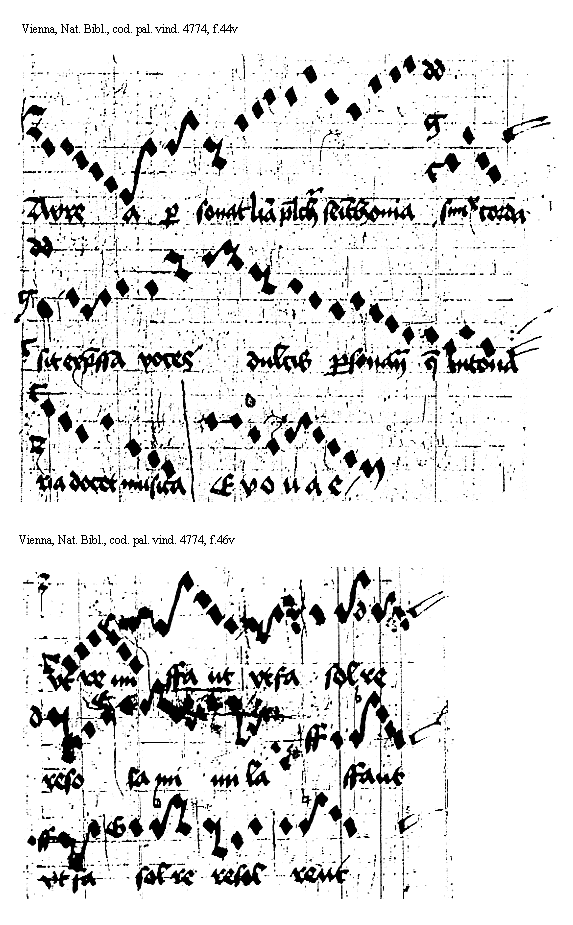[f.44v] [Vienna, Nat. Bibl., cod. pal. vind. 4774, f.44v; text: Avrea personat Nam pulchra semithonia similiter corda sit expressa voces dulcis personancii que intonaria docet musica, Evuoae] [ANOHOL3 03GF]