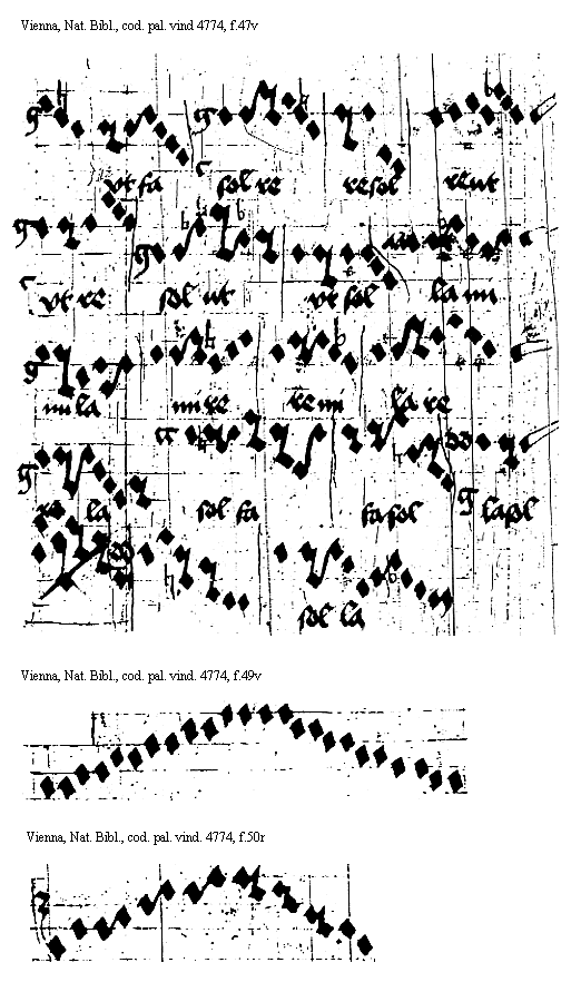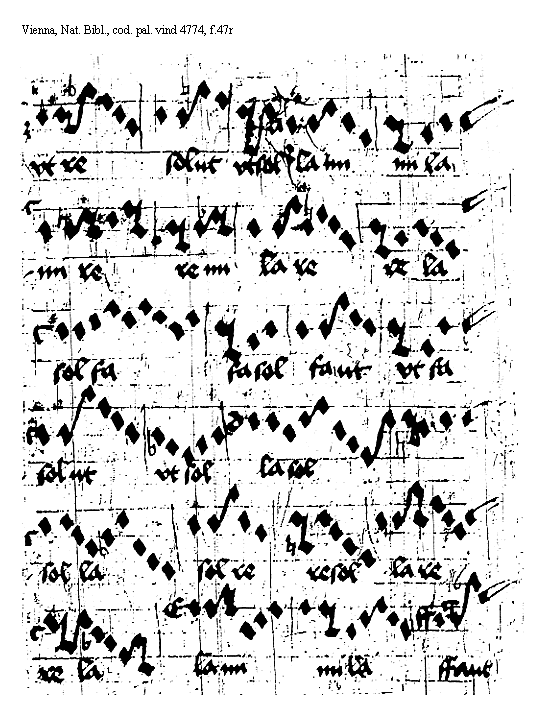 [f.47r] [Vienna, Nationalbibliothek, cod. pal. vind. 4774, f.47r; text: lami, mila, vtfa, solre, resol, Faut, vtre, solut, vtsol, mire, remi, lare, rela, solfa, fasol, faut, lasol, solla] [ANOHOL3 04GF]