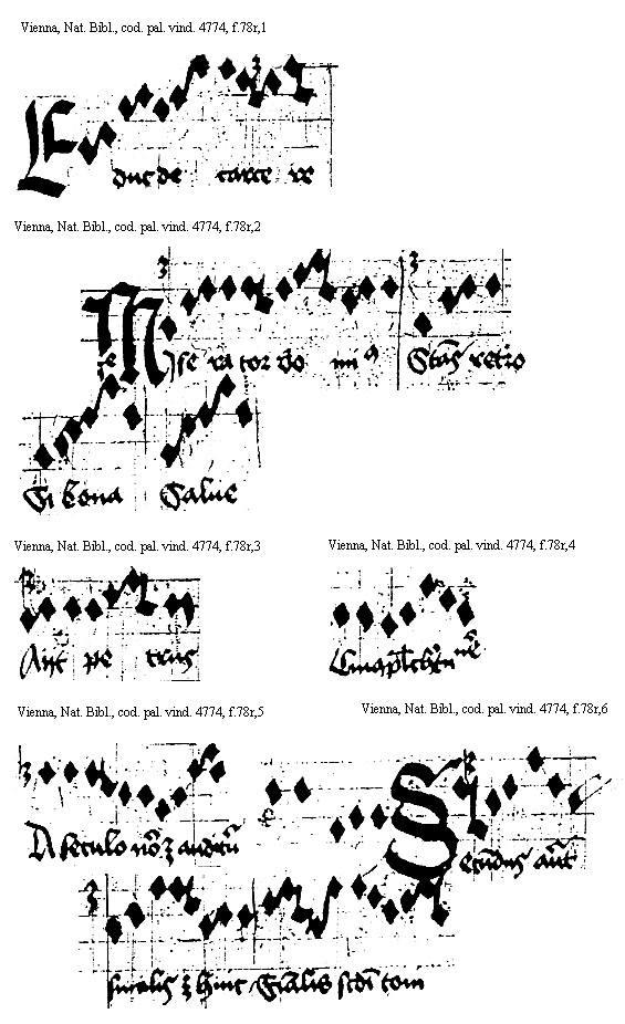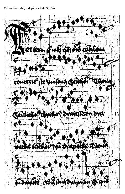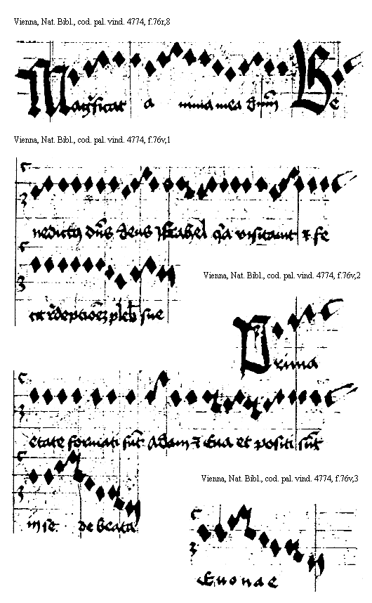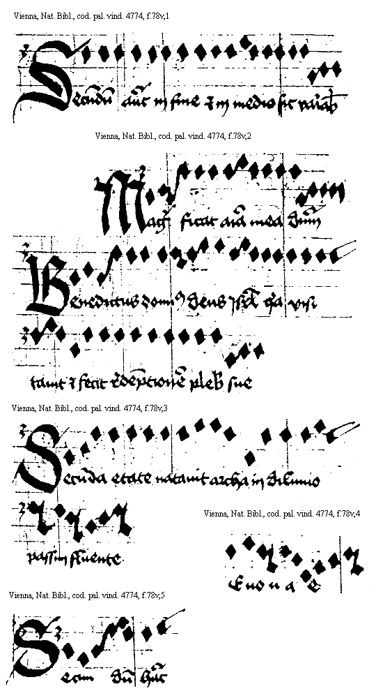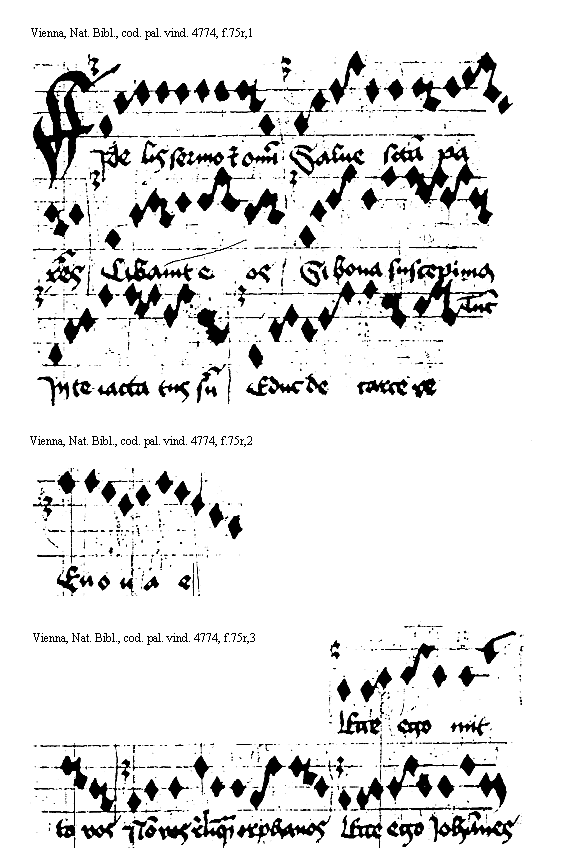 [Vienna, Nationalbibliothek, cod. pal. vind. 4774, f.75v,3; text: Primum querite regnum dei, Leua Ierusalem, Tu bis ductilibus, Fontes et omnia] [ANOHOL3 20GF]