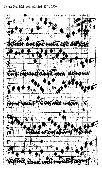 [f.59v] [Vienna, Nationalbibliothek, cod. pal. vind. 4774, f.59v; text: delectant eius hunc modum esse agnoscat Eumque tam paucis clausilem [corr.] tota armonia formetur vtilissimum est eas alte memorie commendare nec prius ab huiusmodi studio resilire donec vocum interuallis cognitis] [ANOHOL3 08GF]