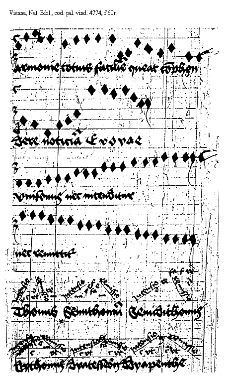 [f.60v] [Vienna, Nationalbibliothek, cod. pal. vind. 4774, f.60v; text: Intensio, remissio, d, f, re, fa, vt, c, Semithonium cum dyapenthe, Thonus cum dyapente, a, la, Dypason, Sillabicatorium modorum exemplariter breuiter in notis musicis, Figura repromissa de natura dyapason in qua continentur tribus principales consonancie musice scilicet dyatesseron dyapenthe et dyapason, Thonus, Semithonium, Dythonus, Semidithonus, Dyatesseron, Dyapenthe] [ANOHOL3 10GF]