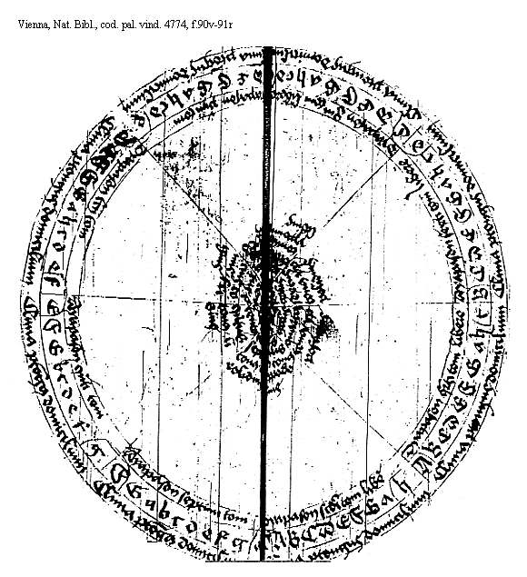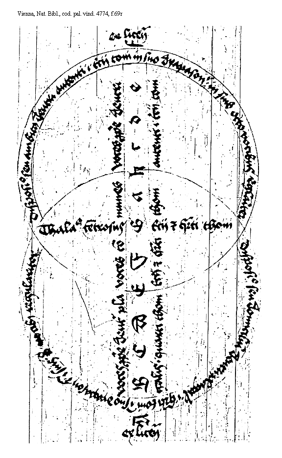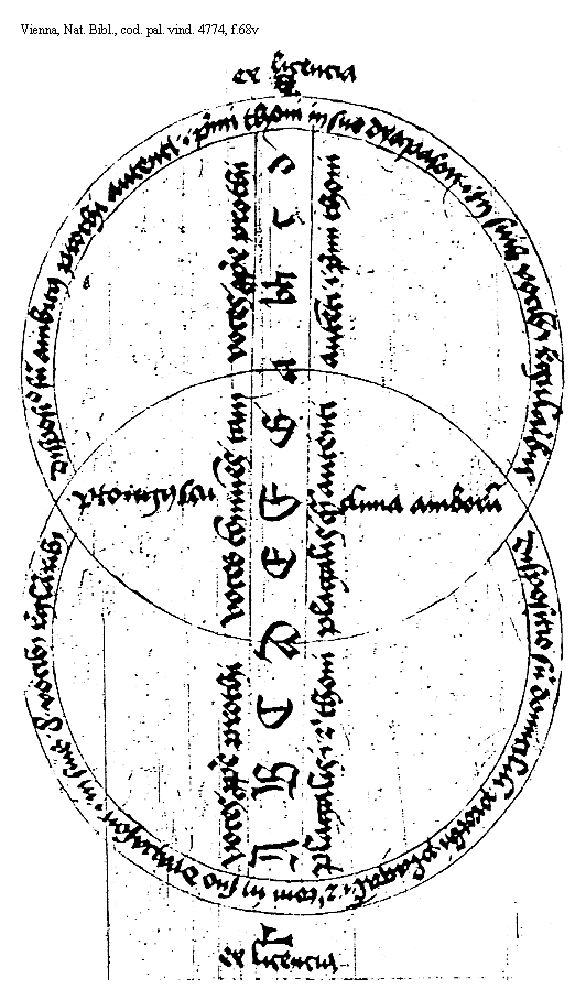 [f.67v] <N>ota iam existunt et prout existit in figuris ordinatis semper inferior rotula plagalem cantum cuius sit toni ostendit. superior vero autentum id est magistrum cuiuslibet inferiorum toni cuius de quattuor superiorum cantus sit demonstrat Et ita sencias in omnibus aliis figuris Et licet superius dictum sit Quod ambitus est littera bis sumpta claudens secundum ascensum et descensum quemlibet tonum per modo dyapason tamen propter ebetem specierum paruulorum vt melius intelligant percurrendum est in singulis exemplariter et figuratur. Vnde in his figuris positis vt nec pro obiecto excursus primi toni et secundi quantum ars et regula admittit describitur Est primi excursus a D finali vsque ad d minutum superacutum. licencialiter autem a d vsque ad f superacutum Excursus autem secundi thoni est ab A graui vsque ad [f.68r] a acutum regulariter. licencialiter autem a [Gamma] greco vsque ad c acutum Et nota sicut dictas figuras intuenti patet quomodo quere voces proprie dicuntur plagalium. vtputa tres littere priores inferioris circuli cuiuslibet figure de numero quattuor figurarum Quere vero proprie dicuntur autentorum vt puta tres littere superioris circuli. Littere vero in medio duorum centrorum connexorum posite quarum numerus semper est quinarius. Dicuntur communes vsque thono Et sicut declaratum est de duabus figuris primi et secundi thoni. ita de singulis intelligatur/