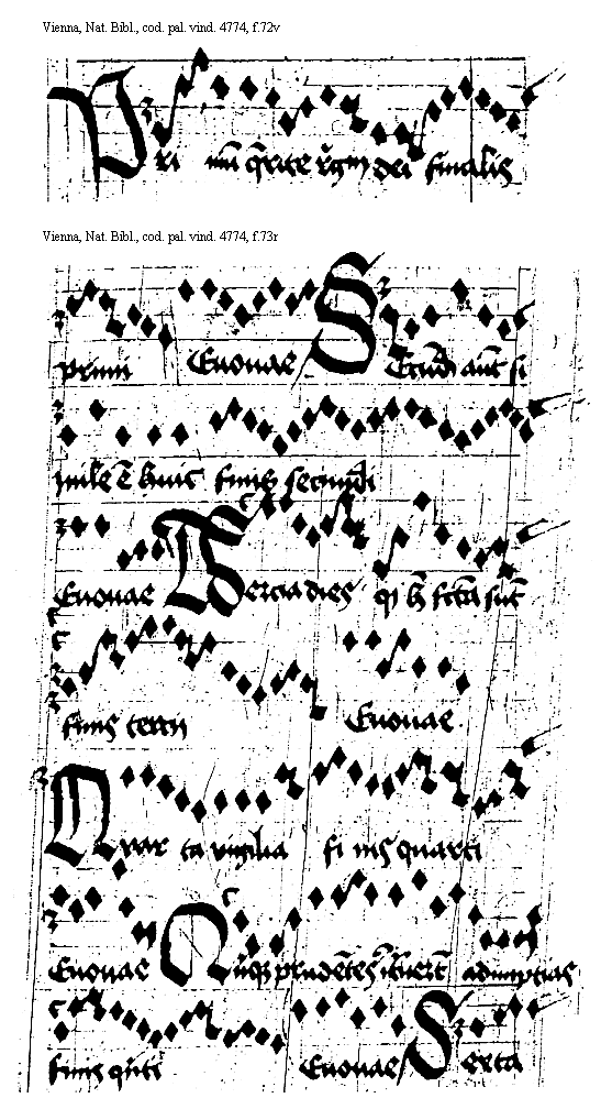 <P>ost determinacionem ipsorum tonorum secundum ordinem et disposicionem figurarum atque legittimis eorundem finalibus sedibus posicionem dyapason vocumque propriarum enodacionem domiciliorum et ambituum meram purificacionem Nunc agendum est de eorum tenoribus et differenciis Sicut igitur octo sunt toni ita et octo sunt eorum tonores Tenor autem a teneo sicut a niteo nitor. et sicut a doceo doctor dicitur Et tenores quidem in musica vocamus vbi prima sillaba [f.71v] in seculorum amen cuiuslibet toni incipitur vt si cantus cessat in re tenor imponitur in alamire vel in Ffaut Si in Elami cessat tunc tenor in csolfaut vel iterum in alamire Si vero cantus cessat in F. tunc tenor imponitur in csolfaut vel alamire Si vero cantus finitur in [[A]] G finali tunc tenor imponitur in [[Dl]] dlasolre vel csolfaut. Quasdam enim modulaciones claues tenent et ad cognoscendum nobis cantum aditum preparant. Notandum autem sicut [corr.] Quod fines octo tonorum in quattuor notis locantur et deponuntur que et ob id eciam finales dicuntur dispositi sunt Sic octo tenoribus videlicet tenorum aptitudinibus note quattuor sunt attribute sed diuersimode Semper enim duorum tenorum finis respicit ad vnam clauem [finalem tantum in marg.] [f.72r] finalem tantum et non ad plurium In tenoribus vero non est ita Nam nunc quidem vnus in vna nunc vero tres in vna clauis annotacione assignantur Est autem in F tenor secundi toni in re imponendus In a acuta vero tenor primi quarti sextique In c acuta tenor tertii quinti et octaui In d superacuta septimi. nec incongrue tenor septimi et secundi tonorum singularia loca sibi vsurpauerunt Quoniam sicut secundus maxime descendit ita septimus peromnibus ascendit De quibus tenoribus et eorum locacionibus tales versus assignantur et primo quantum ad incepciones Primus quartus sextus habent alamire tenorem Fa secundus habet pre reliquis ymus septimus dlasolre tenebit octauo terno quinto csolfaut adest Singula iura tenent loca septimus [f.72v] atque secundus. Pre reliquis ymus contra cum sit et ille supremus Alii quantum ad finales vocum tonorum. In re pri ve secun ter vel quart expliciunt mi. In fa sex quin sep aut oc explicit in sol. Alii simul quantum ad inicia et fines Pri re la. se re fa. ter mi fa quart quoque mi la Quin fa fa. sex fa la sep ut sol oc quoque vt fa De finalibus exempla daturi digni durius ad demonstrandum plenius troporum cognicionem cantuum claues quasdam subdere. quas eciam aptitudines seu finales appellare possimus sunt autem he