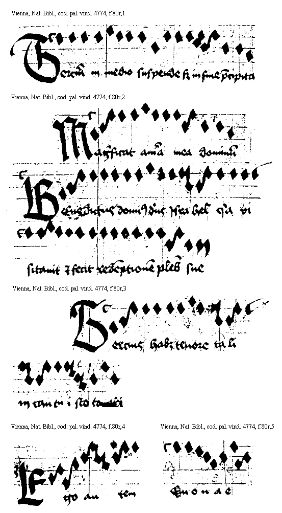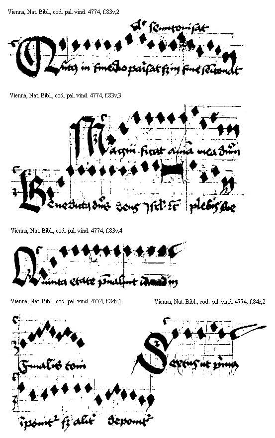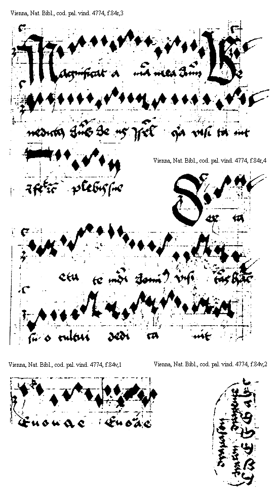 [Vienna, Nationalbibliothek, cod. pal. vind. 4774, f.84r,3; text: Magnificat anima mea dominum, Benedictus dominus deus Israel quia visitauit et fecit et cetera plebis sue] [ANOHOL3 39GF]