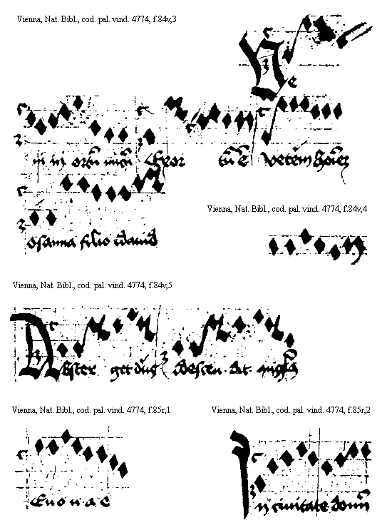 [Vienna, Nationalbibliothek, cod. pal. vind. 4774, f.84v,3; text: Veni in ortum meum, Exortum est, Veterem hominem, Osanna filio David] [ANOHOL3 40GF]